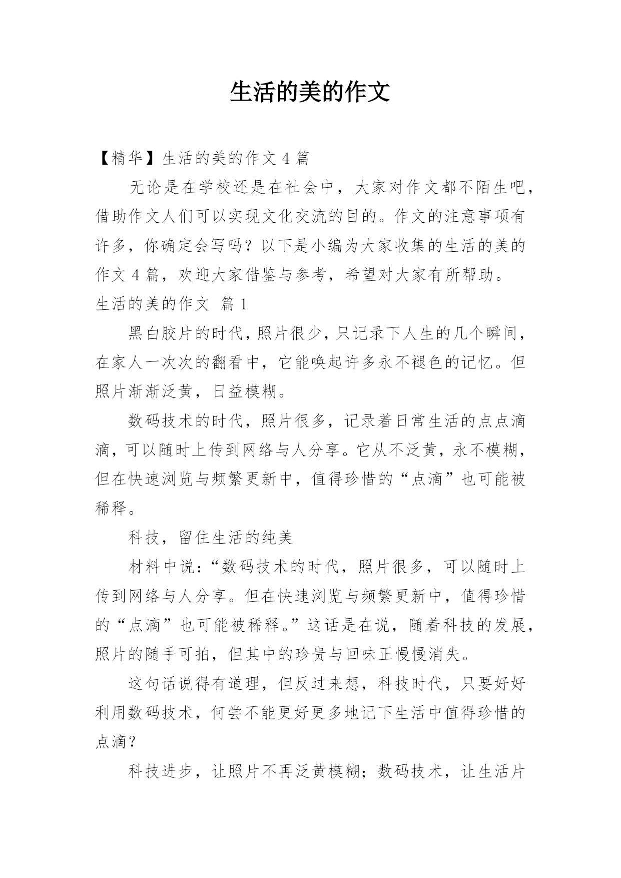 生活的美的作文【精华】生活的美的作文4篇无论是在学校还是在社会中,大家对作文都不陌生吧,借助作文人们可以实现文化交流的目的。作文的注意事项有许多,你确定会写吗?以下是小编为大家收集的生活的美的作文4篇,欢迎大家借鉴与参考,希望对大家有所帮助。生活的美的作文篇1黑白胶片的时代,照片很少,只记录下人生的几个瞬间,在家人一次次的翻看中,它能唤起许多永不褪色的记忆。但照片渐渐泛黄,日益模糊。数码技术的时代,照片很多,记录着日常生活的点点滴滴,可以随时上传到网络与人分享。它从不泛黄,永不模糊,但在快速浏览与频繁更新