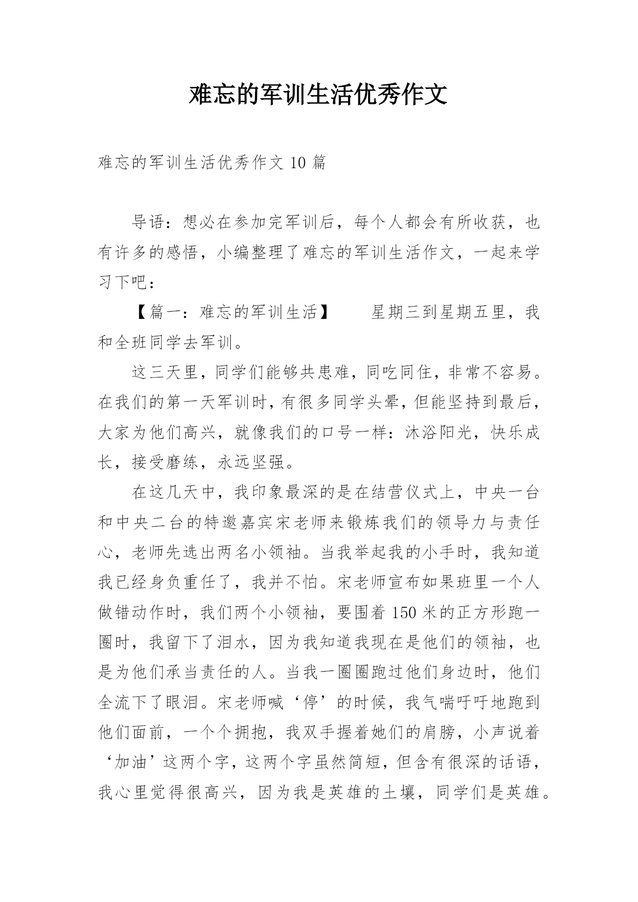 难忘的军训生活优秀作文难忘的军训生活优秀作文10篇导语:想必在参加完军训后,每个人都会有所收获,也有许多的感悟,小编整理了难忘的军训生活作文,一起来学习下吧:【篇一:难忘的军训生活】星期三到星期五里,我和全班同学去军训。这三天里,同学们能够共患难,同吃同住,非常不容易。在我们的第一天军训时,有很多同学头晕,但能坚持到最后,大家为他们高兴,就像我们的口号一样:沐浴阳光,快乐成长,接受磨练,永远坚强。在这几天中,我印象最深的是在结营仪式上,中央一台和中央二台的特邀嘉宾宋老师来锻炼我们的领导力与责任心,老师先选