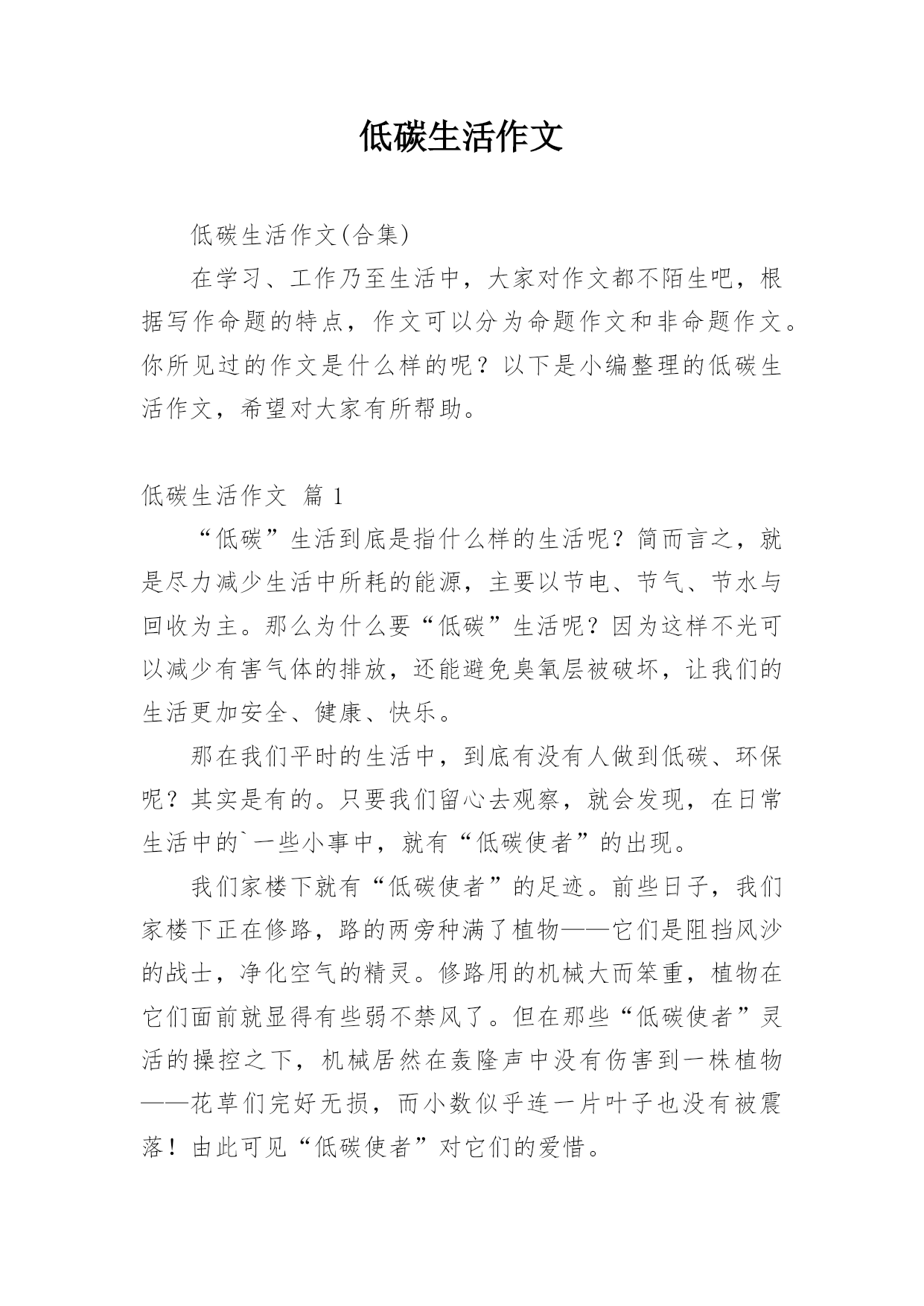 低碳生活作文低碳生活作文(合集)在学习、工作乃至生活中,大家对作文都不陌生吧,根据写作命题的特点,作文可以分为命题作文和非命题作文。你所见过的作文是什么样的呢?以下是小编整理的低碳生活作文,希望对大家有所帮助。低碳生活作文篇1“低碳”生活到底是指什么样的生活呢?简而言之,就是尽力减少生活中所耗的能源,主要以节电、节气、节水与回收为主。那么为什么要“低碳”生活呢?因为这样不光可以减少有害气体的排放,还能避免臭氧层被破坏,让我们的生活更加安全、健康、快乐。那在我们平时的生活中,到底有没有人做到低碳、环保呢?其