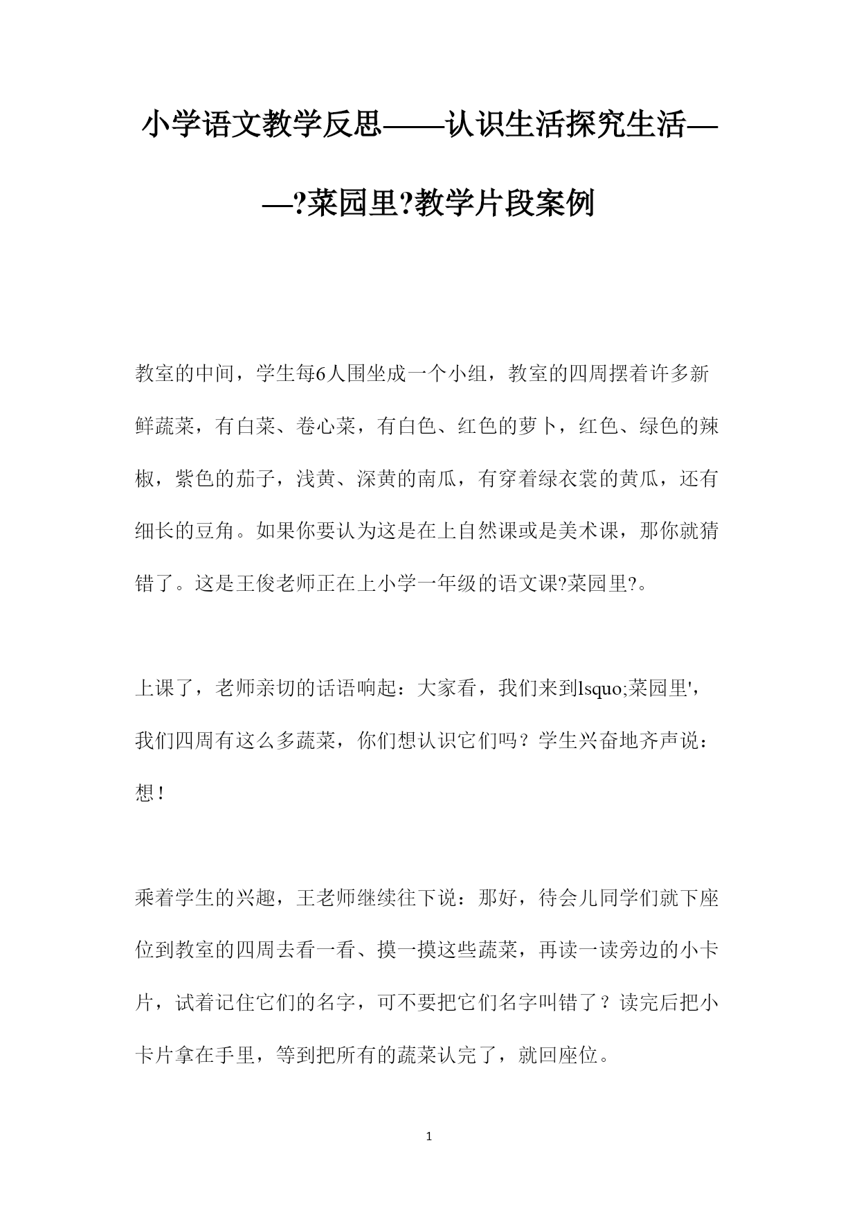 PAGEPAGE6小学语文教学反思——认识生活探究生活——?菜园里?教学片段案例教室的中间,学生每6人围坐成一个小组,教室的四周摆着许多新鲜蔬菜,有白菜、卷心菜,有白色、红色的萝卜,红色、绿色的辣椒,紫色的茄子,浅黄、深黄的南瓜,有穿着绿衣裳的黄瓜,还有细长的豆角。如果你要认为这是在上自然课或是美术课,那你就猜错了。这是王俊老师正在上小学一年级的语文课?菜园里?。上课了,老师亲切的话语响起:大家看,我们来到lsquo;菜园里',我们四周有这么多蔬菜,你们想认识它们吗?学生兴奋地齐声说:想!乘着