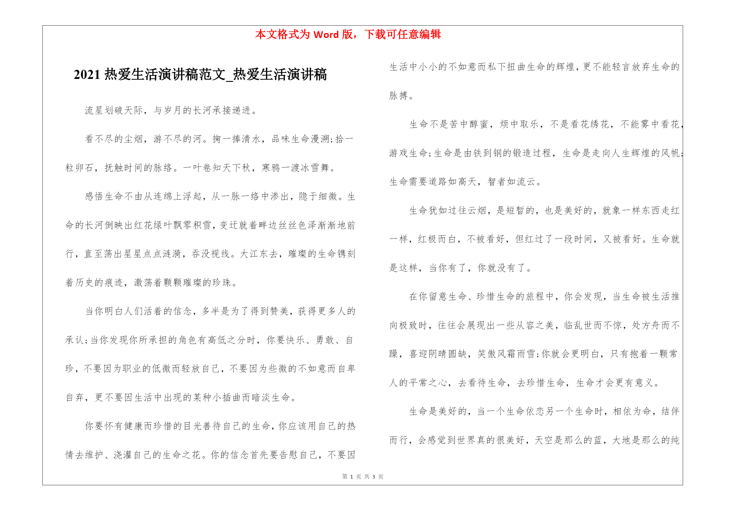 2021热爱生活演讲稿范文-热爱生活演讲稿.docx