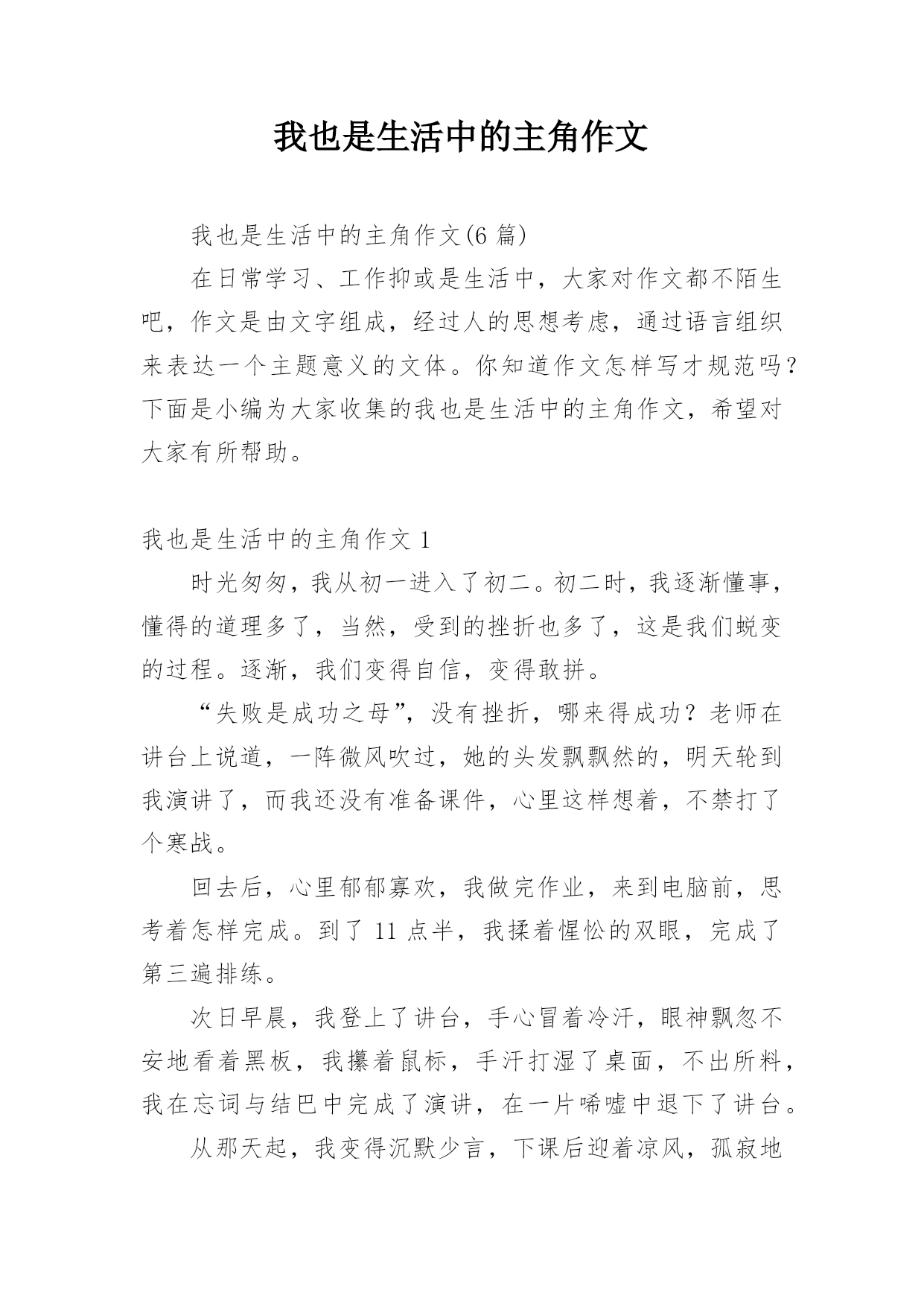 我也是生活中的主角作文我也是生活中的主角作文(6篇)在日常学习、工作抑或是生活中,大家对作文都不陌生吧,作文是由文字组成,经过人的思想考虑,通过语言组织来表达一个主题意义的文体。你知道作文怎样写才规范吗?下面是小编为大家收集的我也是生活中的主角作文,希望对大家有所帮助。我也是生活中的主角作文1时光匆匆,我从初一进入了初二。初二时,我逐渐懂事,懂得的道理多了,当然,受到的挫折也多了,这是我们蜕变的过程。逐渐,我们变得自信,变得敢拼。“失败是成功之母”,没有挫折,哪来得成功?老师在讲台上说道,一阵微风吹过,她