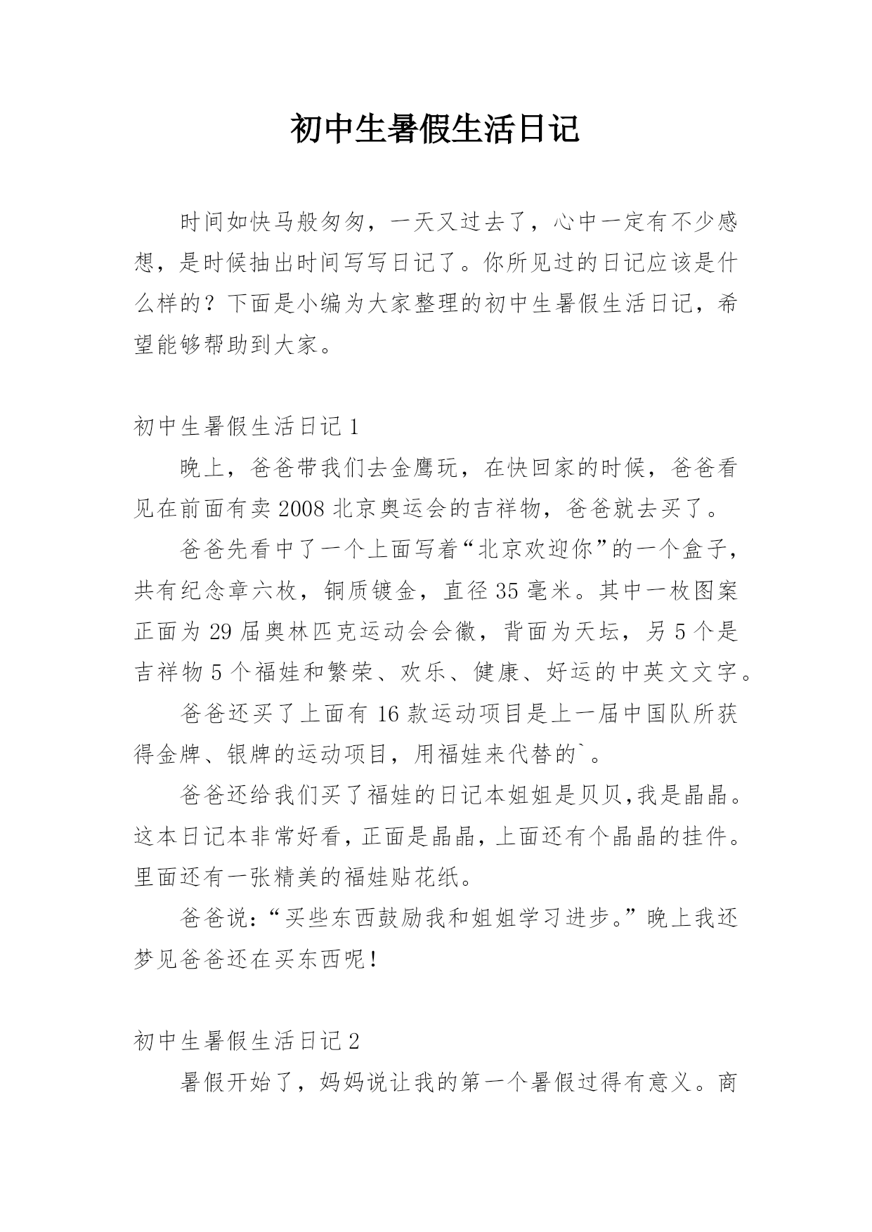 初中生暑假生活日记时间如快马般匆匆,一天又过去了,心中一定有不少感想,是时候抽出时间写写日记了。你所见过的日记应该是什么样的?下面是小编为大家整理的初中生暑假生活日记,希望能够帮助到大家。初中生暑假生活日记1晚上,爸爸带我们去金鹰玩,在快回家的时候,爸爸看见在前面有卖2008北京奥运会的吉祥物,爸爸就去买了。爸爸先看中了一个上面写着“北京欢迎你”的一个盒子,共有纪念章六枚,铜质镀金,直径35毫米。其中一枚图案正面为29届奥林匹克运动会会徽,背面为天坛,另5个是吉祥物5个福娃和繁荣、欢乐、健康、好运的中英文