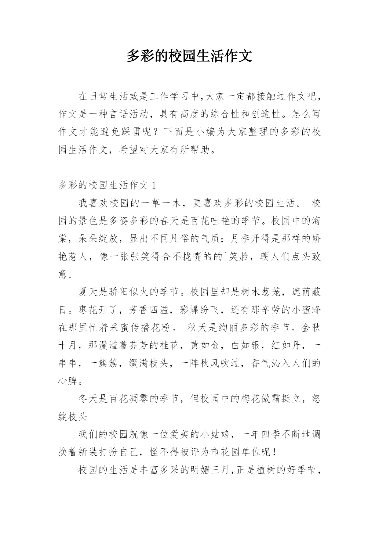 多彩的校园生活作文在日常生活或是工作学习中,大家一定都接触过作文吧,作文是一种言语活动,具有高度的综合性和创造性。怎么写作文才能避免踩雷呢?下面是小编为大家整理的多彩的校园生活作文,希望对大家有所帮助。多彩的校园生活作文1我喜欢校园的一草一木,更喜欢多彩的校园生活。校园的景色是多姿多彩的春天是百花吐艳的季节。校园中的海棠,朵朵绽放,显出不同凡俗的气质;月季开得是那样的娇艳惹人,像一张张笑得合不拢嘴的的`笑脸,朝人们点头致意。夏天是骄阳似火的季节。校园里却是树木葱茏,遮荫蔽日。枣花开了,芳香四溢,彩蝶纷飞,