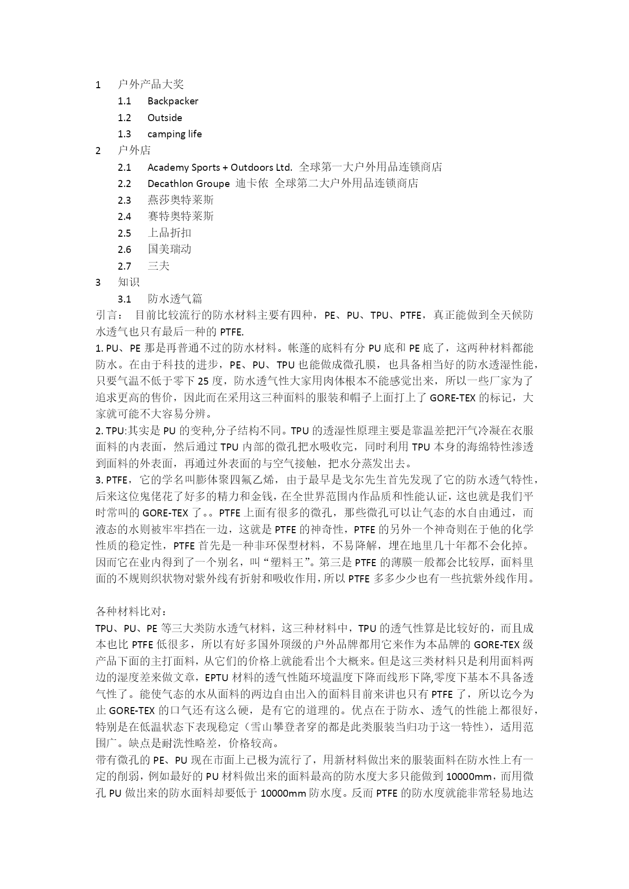 户外产品大奖BackpackerOutsidecampinglife户外店AcademySports+OutdoorsLtd.全球第一大户外用品连锁商店DecathlonGroupe迪卡侬全球第二大户外用品连锁商店燕莎奥特莱斯赛特奥特莱斯上品折扣国美瑞动三夫知识防水透气篇引言:目前比较流行的防水材料主要有四种,PE、PU、TPU、PTFE,真正能做到全天候防水透气也只有最后一种的PTFE.1.PU、PE那是再普通不过的防水材料。帐蓬的底料有分PU底和PE底了,这两种材料都能防水。在由于科技的进步,PE、P