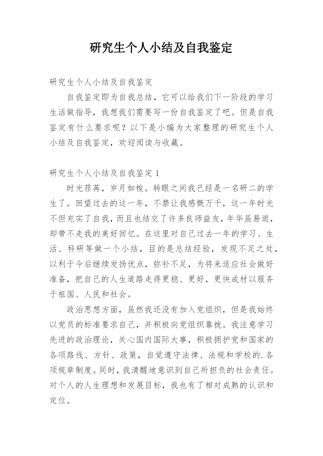 研究生个人小结及自我鉴定研究生个人小结及自我鉴定自我鉴定即为自我总结,它可以给我们下一阶段的学习生活做指导,我想我们需要写一份自我鉴定了吧。但是自我鉴定有什么要求呢?以下是小编为大家整理的研究生个人小结及自我鉴定,欢迎阅读与收藏。研究生个人小结及自我鉴定1时光荏苒,岁月如梭。转眼之间我已经是一名研二的学生了。回望过去的这一年,不禁让我感慨万千,这一年时光不但充实了自我,而且也结交了许多良师益友,年华虽易逝,却带不走我的美好回忆。在这里对自己过去一年的学习、生活、科研等做一个小结,目的是总结经验,发现不足之