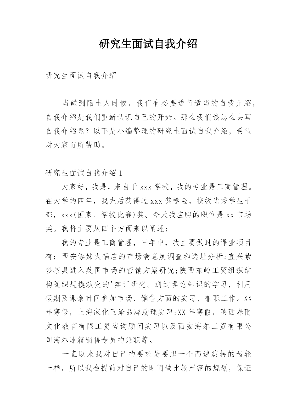 研究生面试自我介绍研究生面试自我介绍当碰到陌生人时候,我们有必要进行适当的自我介绍,自我介绍是我们重新认识自己的开始。那么我们该怎么去写自我介绍呢?以下是小编整理的研究生面试自我介绍,希望对大家有所帮助。研究生面试自我介绍1大家好,我是,来自于xxx学校,我的专业是工商管理。在大学的四年,我先后获得过xxx奖学金,校级优秀学生干部,xxx(国家、学校比赛)奖。今天我应聘的职位是xx市场类。我将主要从四个方面来以阐述:我的专业是工商管理,三年中,我主要做过的课业项目有:西安傣妹火锅店的市场满意度调查和选址分