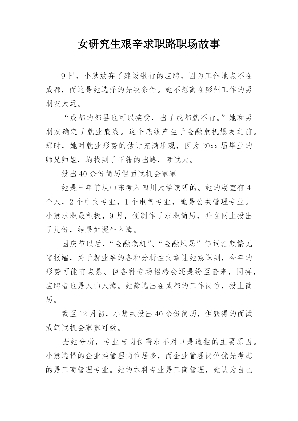 女研究生艰辛求职路职场故事9日,小慧放弃了建设银行的应聘,因为工作地点不在成都,而这是她选择的先决条件。她不想离在彭州工作的男朋友太远。“成都的郊县也可以接受,出了成都就不行。”她和男朋友确定了就业底线。这个底线产生于金融危机爆发之前。那时,她对就业形势的估计充满乐观,因为20xx届毕业的师兄师姐,均找到了不错的出路,考试大。投出40余份简历但面试机会寥寥她是三年前从山东考入四川大学读研的。她的寝室有4个人,2个中文专业,1个电气专业,她是公共管理专业。小慧求职最积极,9月,便制作了求职简历,并在网上投出
