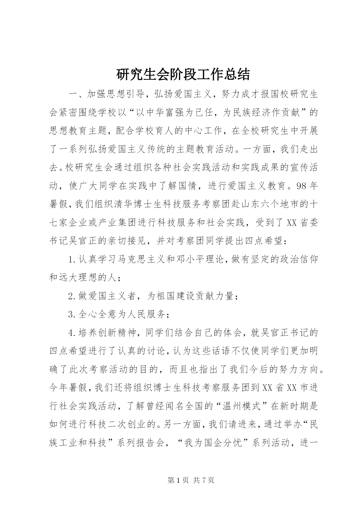 第PAGE\*Arabic\*MERGEFORMAT7页共NUMPAGES\*MERGEFORMAT7页研究生会阶段工作总结一、加强思想引导,弘扬爱国主义,努力成才报国校研究生会紧密围绕学校以“以中华富强为己任,为民族经济作贡献”的思想教育主题,配合学校育人的中心工作,在全校研究生中开展了一系列弘扬爱国主义传统的主题教育活动。一方面,我们走出去。校研究生会通过组织各种社会实践活动和实践成果的宣传活动,使广大同学在实践中了解国情,进行爱国主义教育。98年暑假,我们组织清华博士生科技服务考察团赴山