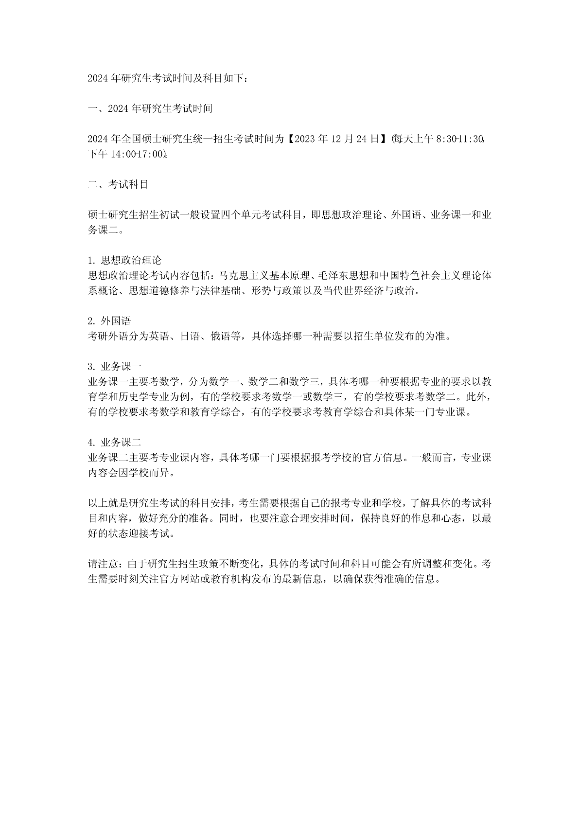2024年研究生考试时间及科目如下:一、2024年研究生考试时间2024年全国硕士研究生统一招生考试时间为【2023年12月24日】(每天上午8:30-11:30,下午14:00-17:00)。二、考试科目硕士研究生招生初试一般设置四个单元考试科目,即思想政治理论、外国语、业务课一和业务课二。1.思想政治理论思想政治理论考试内容包括:马克思主义基本原理、毛泽东思想和中国特色社会主义理论体系概论、思想道德修养与法律基础、形势与政策以及当代世界经济与政治。2.外国语考研外语分为英语、日语、俄语等,具体选择哪一