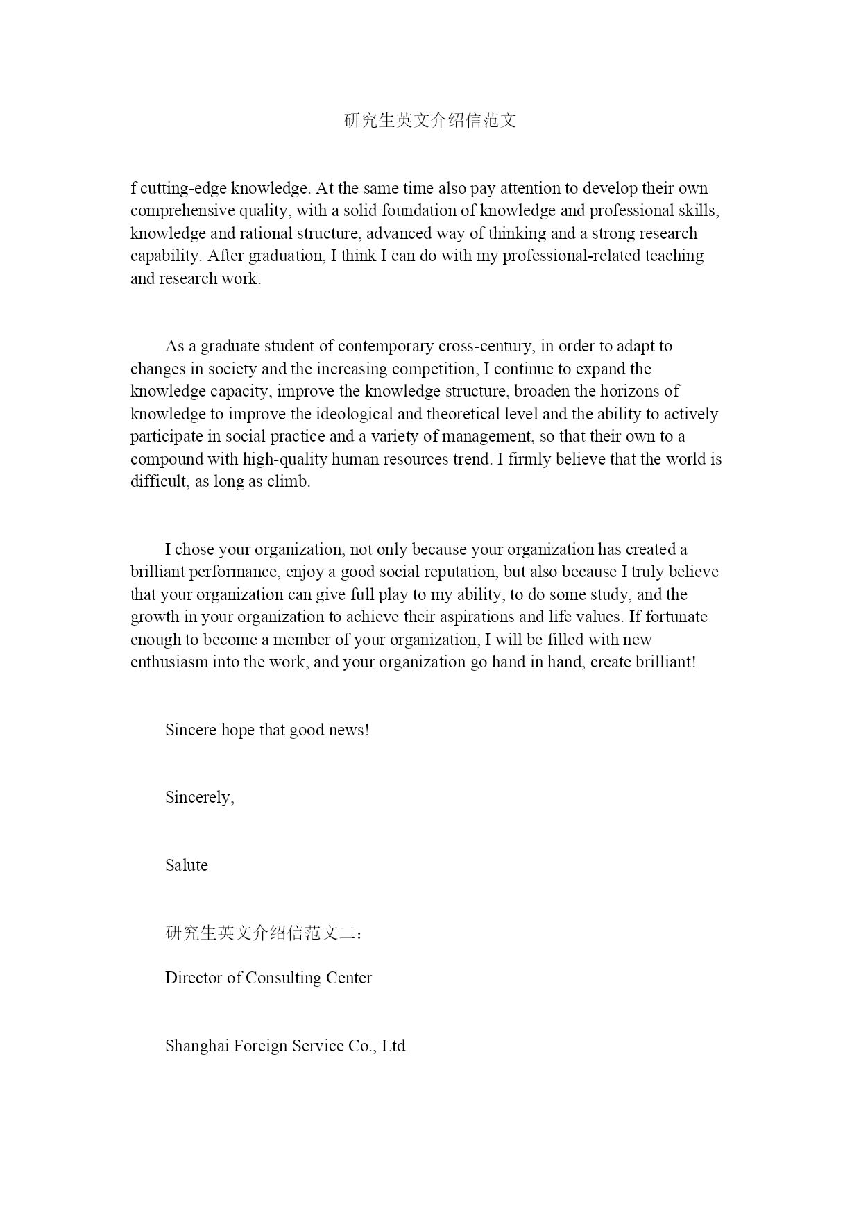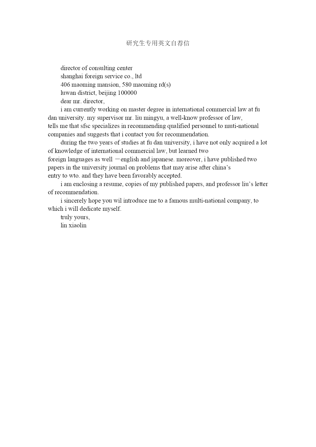 研究生专用英文自荐信directorofconsultingcentershanghaiforeignserviceco.,ltd406maomingmansion,580maomingrd(s)luwandistrict,beijing100000dearmr.director,iamcurrentlyworkingonmasterdegreeininternationalcommerciallawatfudanuniversity.mysupervisormr.liumingyu,awell-know