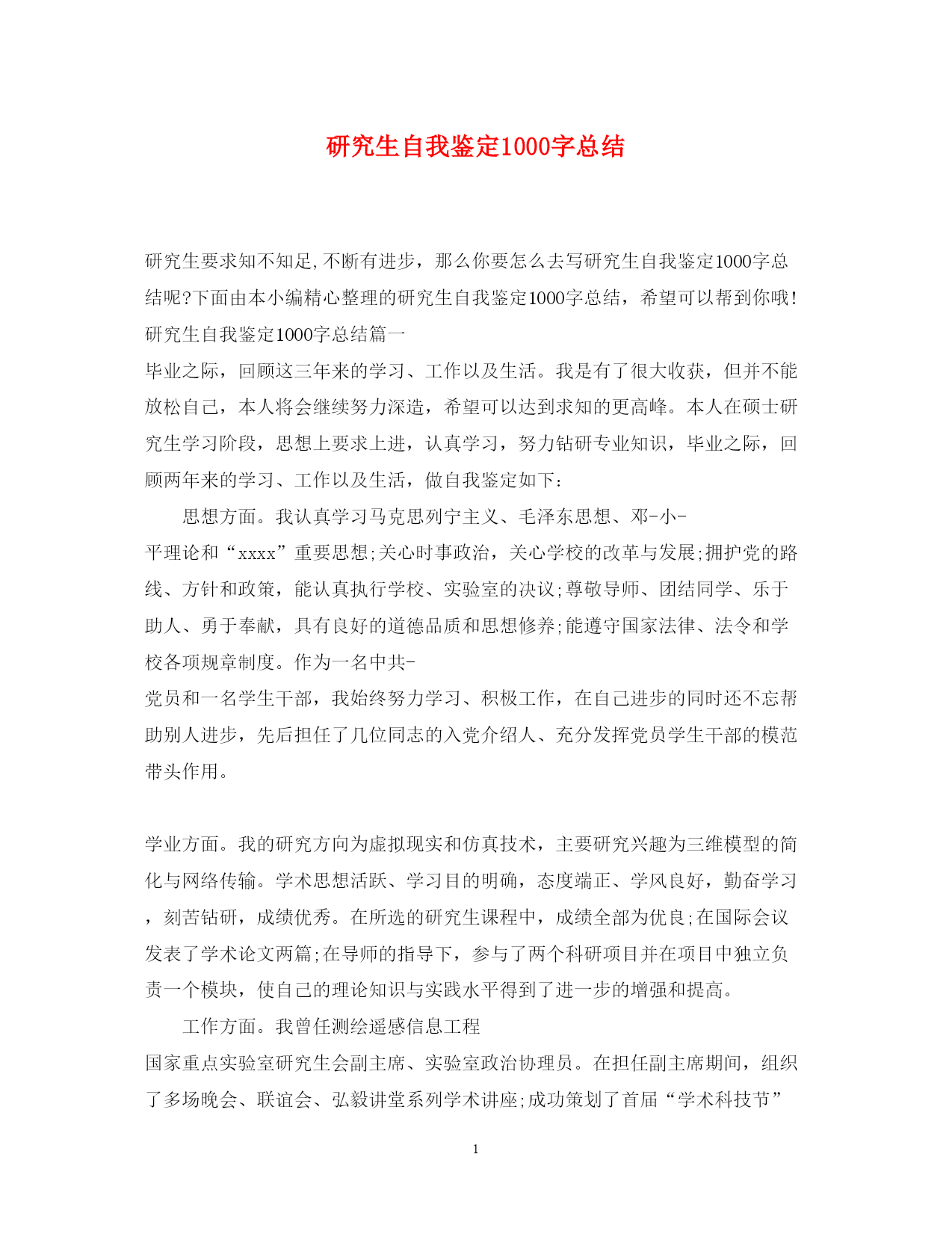 此资料由网络收集而来,如有侵权请告知上传者立即删除。资料共分享,我们负责传递知识。PAGEPAGE5研究生自我鉴定1000字总结研究生要求知不知足,不断有进步,那么你要怎么去写研究生自我鉴定1000字总结呢?下面由本小编精心整理的研究生自我鉴定1000字总结,希望可以帮到你哦!研究生自我鉴定1000字总结篇一毕业之际,回顾这三年来的学习、工作以及生活。我是有了很大收获,但并不能放松自己,本人将会继续努力深造,希望可以达到求知的更高峰。本人在硕士研究生学习阶段,思想上要求上进,认真学习,努力钻研