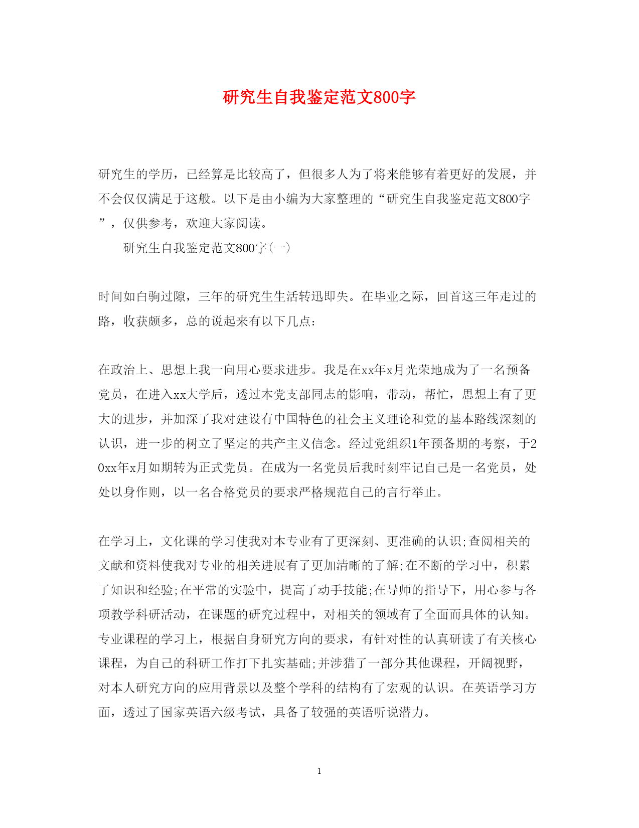 此资料由网络收集而来,如有侵权请告知上传者立即删除。资料共分享,我们负责传递知识。PAGEPAGE7研究生自我鉴定范文800字研究生的学历,已经算是比较高了,但很多人为了将来能够有着更好的发展,并不会仅仅满足于这般。以下是由小编为大家整理的“研究生自我鉴定范文800字”,仅供参考,欢迎大家阅读。研究生自我鉴定范文800字(一)时间如白驹过隙,三年的研究生生活转迅即失。在毕业之际,回首这三年走过的路,收获颇多,总的说起来有以下几点:在政治上、思想上我一向用心要求进步。我是在xx年x月光荣地成为了