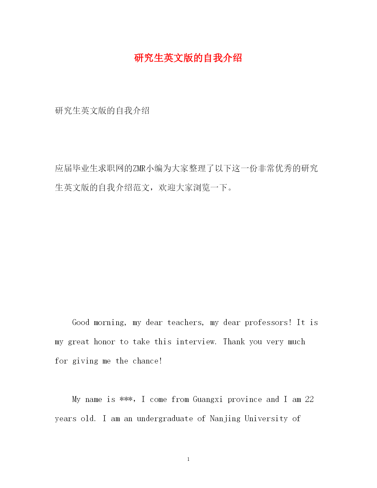 此资料由网络收集而来,如有侵权请告知上传者立即删除。资料共分享,我们负责传递知识。2020研究生英文自我介绍3篇?完检查,突然发现有一题的得数我把数抄错了,把”;506”;抄成了”;609”;,简直是太马虎了。通过两次教训,我下定决心,一定要把这个马虎的坏毛病改掉。以后,我一定要看更多的书,写好每一篇作文,学更多的知识,让老师满意,让爸妈放心,让所有的人都喜欢我,你们愿意做我的好朋友吗?这就是我,一个平凡而又懂事的小姑娘---卫夕梦。阳光女孩自我介绍女孩自我介绍(3)阳光女孩自我介绍(一)亲爱的老师、同学