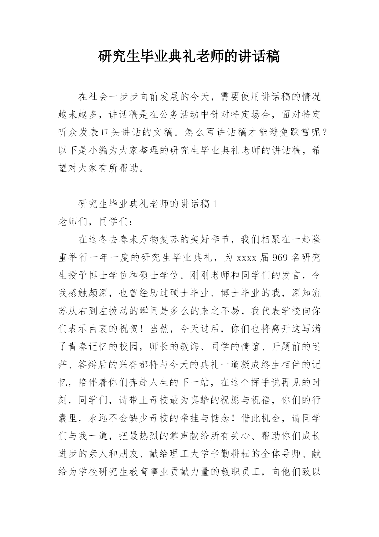研究生毕业典礼老师的讲话稿在社会一步步向前发展的今天,需要使用讲话稿的情况越来越多,讲话稿是在公务活动中针对特定场合,面对特定听众发表口头讲话的文稿。怎么写讲话稿才能避免踩雷呢?以下是小编为大家整理的研究生毕业典礼老师的讲话稿,希望对大家有所帮助。研究生毕业典礼老师的讲话稿1老师们,同学们:在这冬去春来万物复苏的美好季节,我们相聚在一起隆重举行一年一度的研究生毕业典礼,为xxxx届969名研究生授予博士学位和硕士学位。刚刚老师和同学们的发言,令我感触颇深,也曾经历过硕士毕业、博士毕业的我,深知流苏从右到左