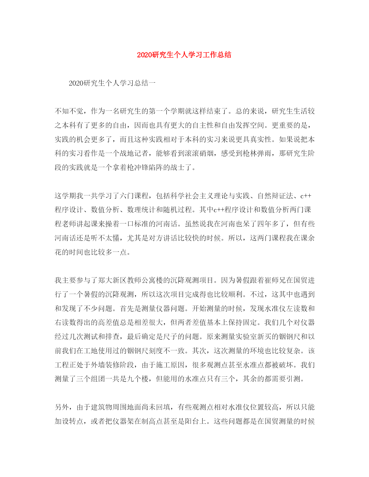 此资料由网络收集而来,如有侵权请告知上传者立即删除。资料共分享,我们负责传递知识。2020研究生个人学习工作总结2020研究生个人学习总结一不知不觉,作为一名研究生的第一个学期就这样结束了。总的来说,研究生生活较之本科有了更多的自由,因而也具有更大的自主性和自由发挥空间。更重要的是,实践的机会更多了,而且这种实践相对于本科的实习来说更具真实性。如果说把本科的实习看作是一个战地记者,能够看到滚滚硝烟,感受到枪林弹雨,那研究生阶段的实践就是一个拿着枪冲锋陷阵的战士了。这学期我一共学习了六门课程,包括科学社会主