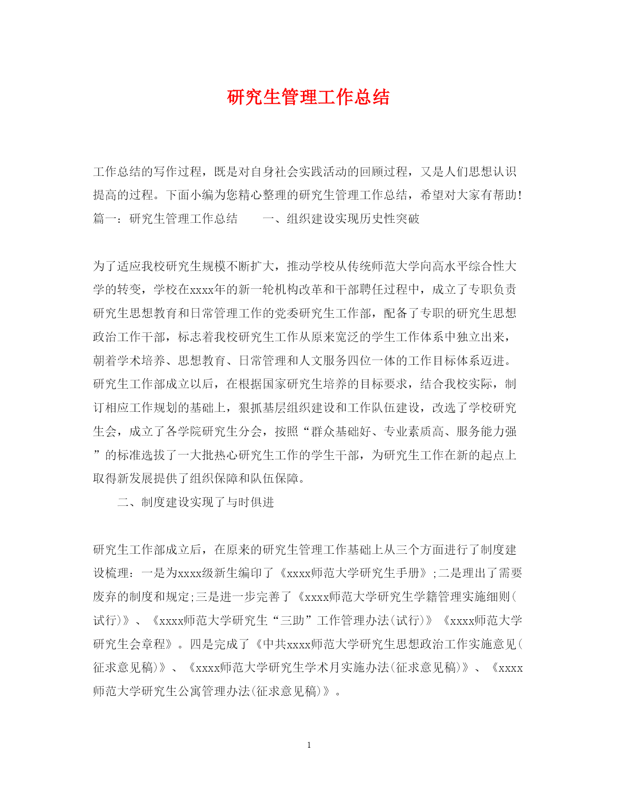 此资料由网络收集而来,如有侵权请告知上传者立即删除。资料共分享,我们负责传递知识。PAGEPAGE5研究生管理工作总结工作总结的写作过程,既是对自身社会实践活动的回顾过程,又是人们思想认识提高的过程。下面小编为您精心整理的研究生管理工作总结,希望对大家有帮助!篇一:研究生管理工作总结一、组织建设实现历史性突破为了适应我校研究生规模不断扩大,推动学校从传统师范大学向高水平综合性大学的转变,学校在xxxx年的新一轮机构改革和干部聘任过程中,成立了专职负责研究生思想教育和日常管理工作的党委研究生工作