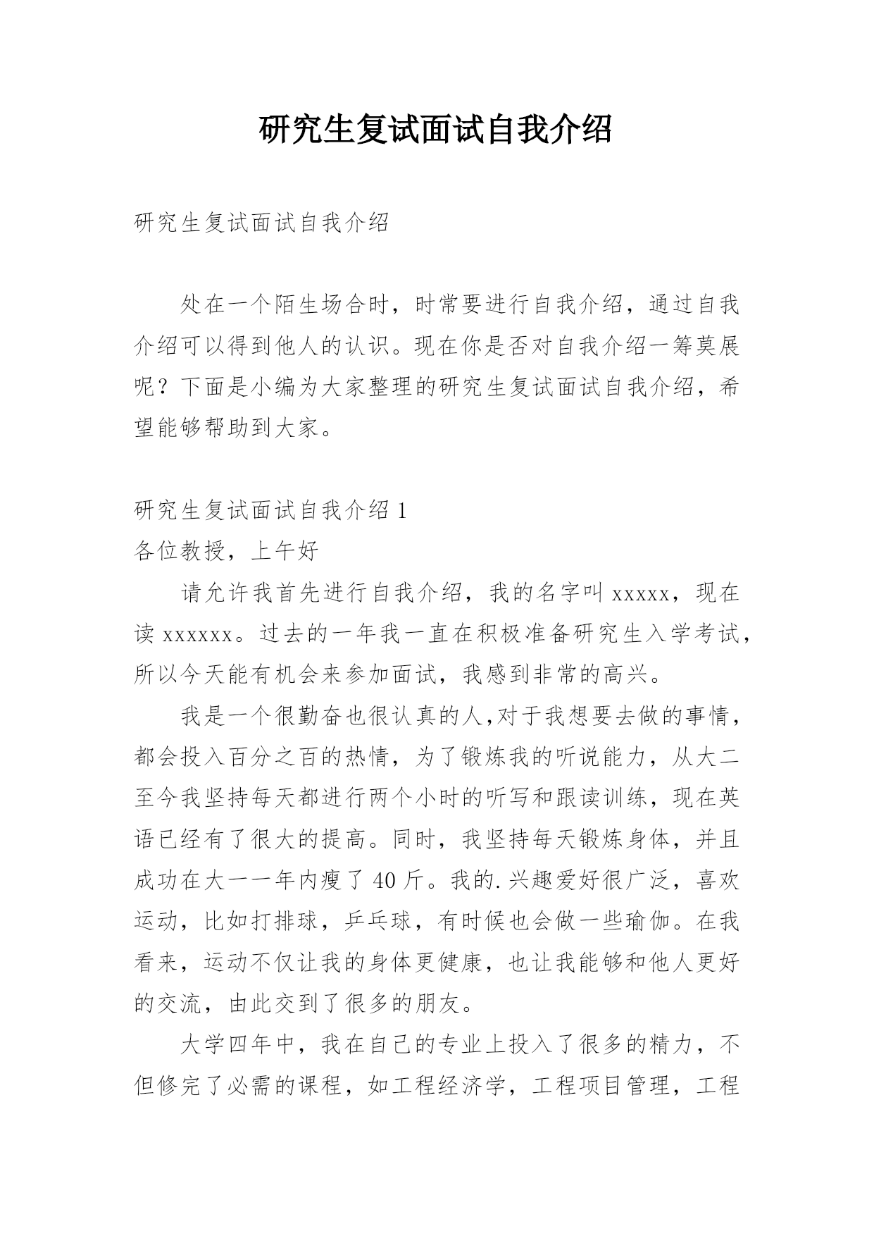 研究生复试面试自我介绍研究生复试面试自我介绍处在一个陌生场合时,时常要进行自我介绍,通过自我介绍可以得到他人的认识。现在你是否对自我介绍一筹莫展呢?下面是小编为大家整理的研究生复试面试自我介绍,希望能够帮助到大家。研究生复试面试自我介绍1各位教授,上午好请允许我首先进行自我介绍,我的名字叫xxxxx,现在读xxxxxx。过去的一年我一直在积极准备研究生入学考试,所以今天能有机会来参加面试,我感到非常的高兴。我是一个很勤奋也很认真的人,对于我想要去做的事情,都会投入百分之百的热情,为了锻炼我的听说能力,从大