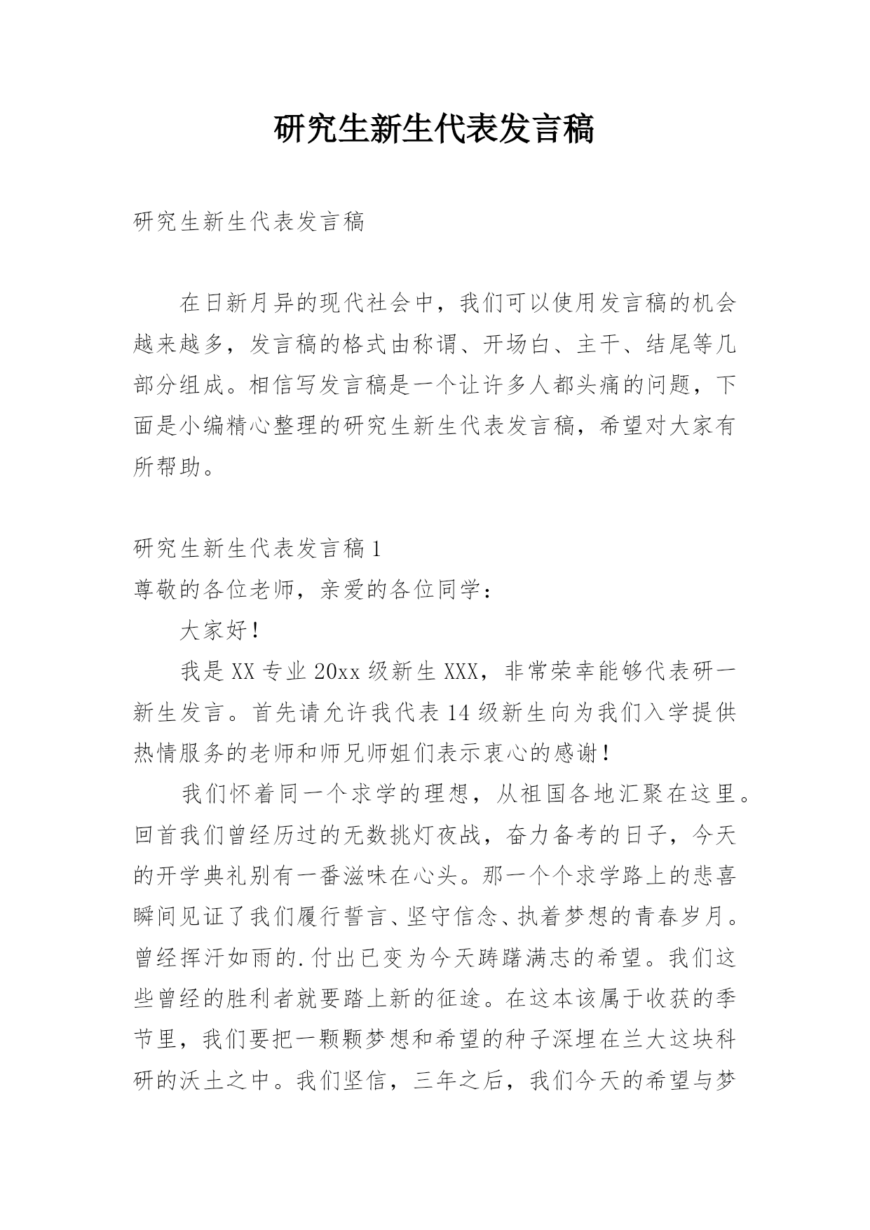 研究生新生代表发言稿研究生新生代表发言稿在日新月异的现代社会中,我们可以使用发言稿的机会越来越多,发言稿的格式由称谓、开场白、主干、结尾等几部分组成。相信写发言稿是一个让许多人都头痛的问题,下面是小编精心整理的研究生新生代表发言稿,希望对大家有所帮助。研究生新生代表发言稿1尊敬的各位老师,亲爱的各位同学:大家好!我是XX专业20xx级新生XXX,非常荣幸能够代表研一新生发言。首先请允许我代表14级新生向为我们入学提供热情服务的老师和师兄师姐们表示衷心的感谢!我们怀着同一个求学的理想,从祖国各地汇聚在这里。