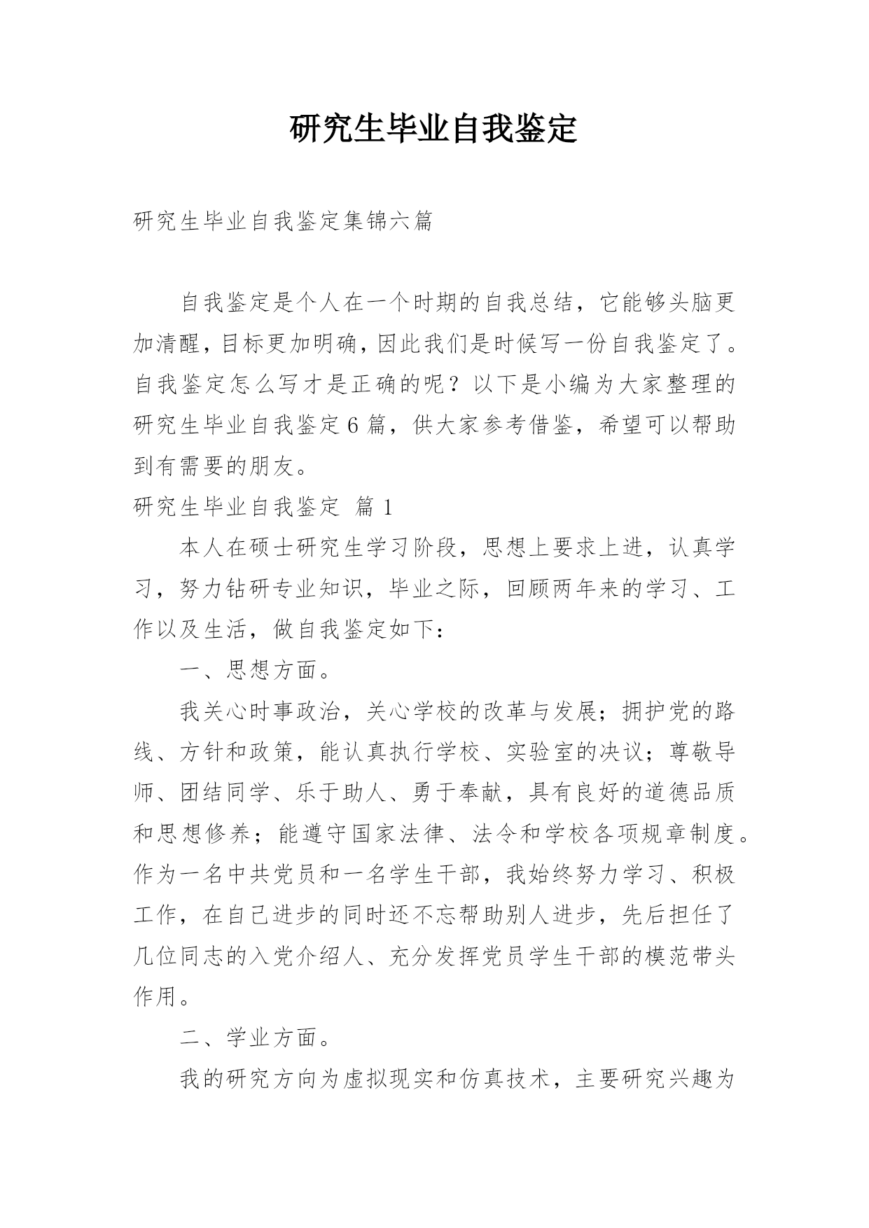 研究生毕业自我鉴定研究生毕业自我鉴定集锦六篇自我鉴定是个人在一个时期的自我总结,它能够头脑更加清醒,目标更加明确,因此我们是时候写一份自我鉴定了。自我鉴定怎么写才是正确的呢?以下是小编为大家整理的研究生毕业自我鉴定6篇,供大家参考借鉴,希望可以帮助到有需要的朋友。研究生毕业自我鉴定篇1本人在硕士研究生学习阶段,思想上要求上进,认真学习,努力钻研专业知识,毕业之际,回顾两年来的学习、工作以及生活,做自我鉴定如下:一、思想方面。我关心时事政治,关心学校的改革与发展;拥护党的路线、方针和政策,能认真执行学校、实