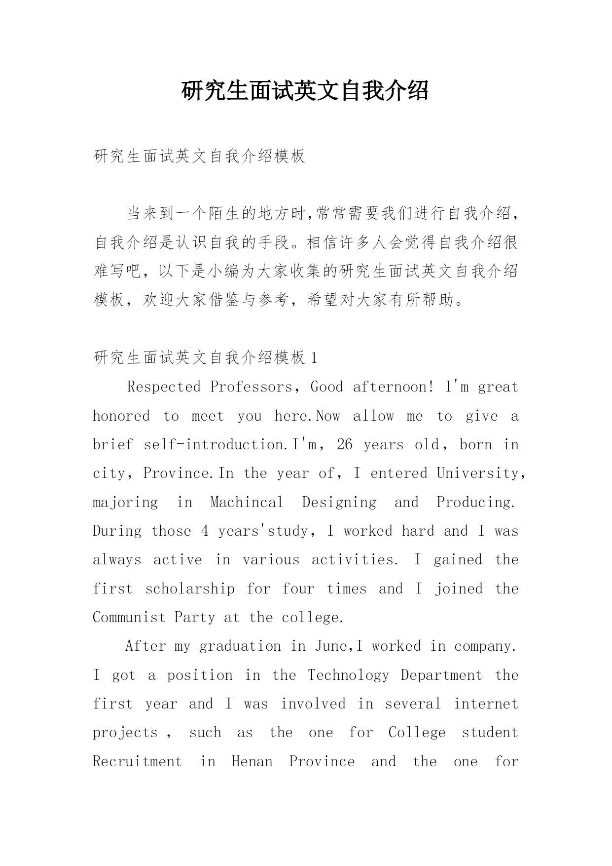 研究生面试英文自我介绍研究生面试英文自我介绍模板当来到一个陌生的地方时,常常需要我们进行自我介绍,自我介绍是认识自我的手段。相信许多人会觉得自我介绍很难写吧,以下是小编为大家收集的研究生面试英文自我介绍模板,欢迎大家借鉴与参考,希望对大家有所帮助。研究生面试英文自我介绍模板1RespectedProfessors,Goodafternoon!I'mgreathonoredtomeetyouhere.Nowallowmetogiveabriefself-introduction.I'm,26yearsold