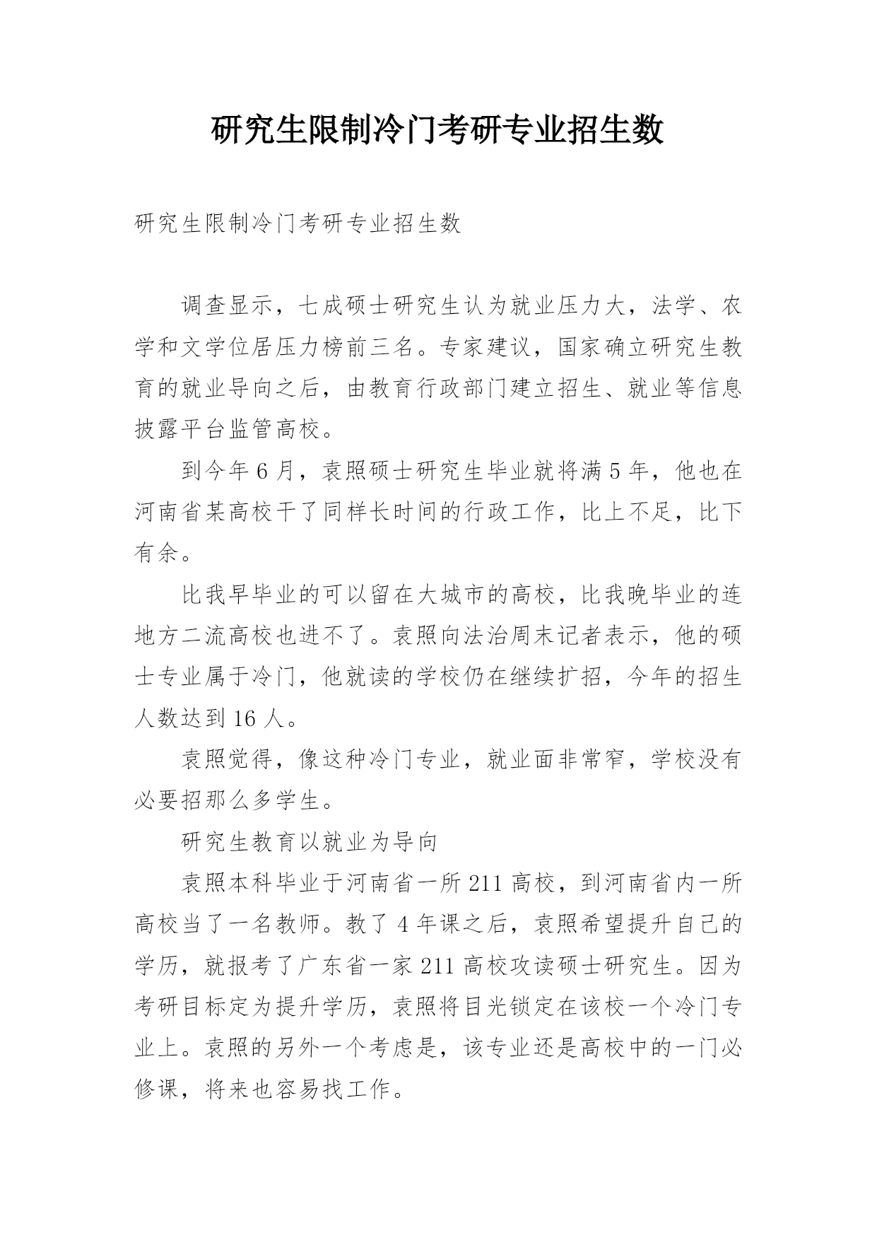 研究生限制冷门考研专业招生数研究生限制冷门考研专业招生数调查显示,七成硕士研究生认为就业压力大,法学、农学和文学位居压力榜前三名。专家建议,国家确立研究生教育的就业导向之后,由教育行政部门建立招生、就业等信息披露平台监管高校。到今年6月,袁照硕士研究生毕业就将满5年,他也在河南省某高校干了同样长时间的行政工作,比上不足,比下有余。比我早毕业的可以留在大城市的高校,比我晚毕业的连地方二流高校也进不了。袁照向法治周末记者表示,他的硕士专业属于冷门,他就读的学校仍在继续扩招,今年的招生人数达到16人。袁照觉得,