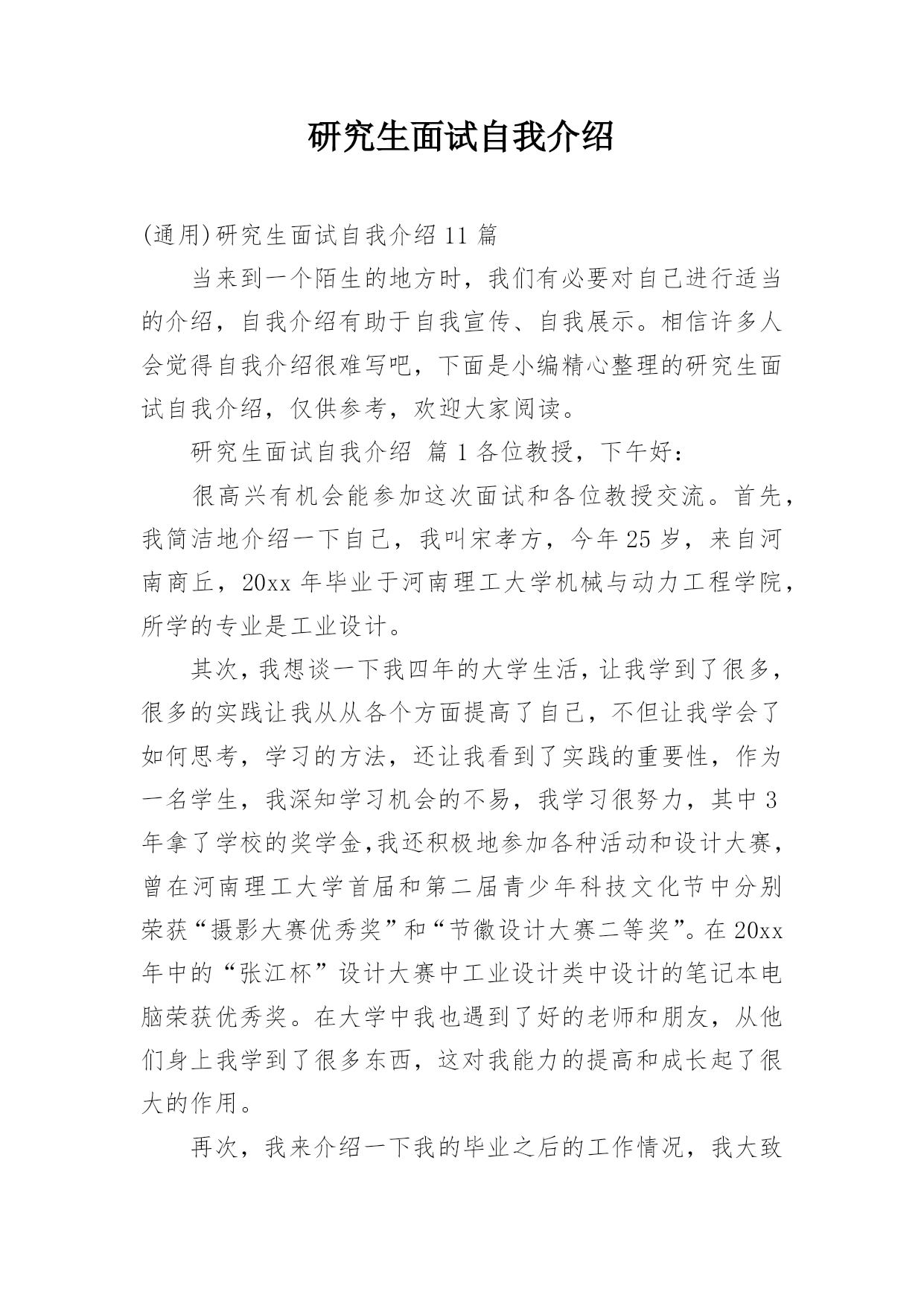 研究生面试自我介绍(通用)研究生面试自我介绍11篇当来到一个陌生的地方时,我们有必要对自己进行适当的介绍,自我介绍有助于自我宣传、自我展示。相信许多人会觉得自我介绍很难写吧,下面是小编精心整理的研究生面试自我介绍,仅供参考,欢迎大家阅读。研究生面试自我介绍篇1各位教授,下午好:很高兴有机会能参加这次面试和各位教授交流。首先,我简洁地介绍一下自己,我叫宋孝方,今年25岁,来自河南商丘,20xx年毕业于河南理工大学机械与动力工程学院,所学的专业是工业设计。其次,我想谈一下我四年的大学生活,让我学到了很多,很多