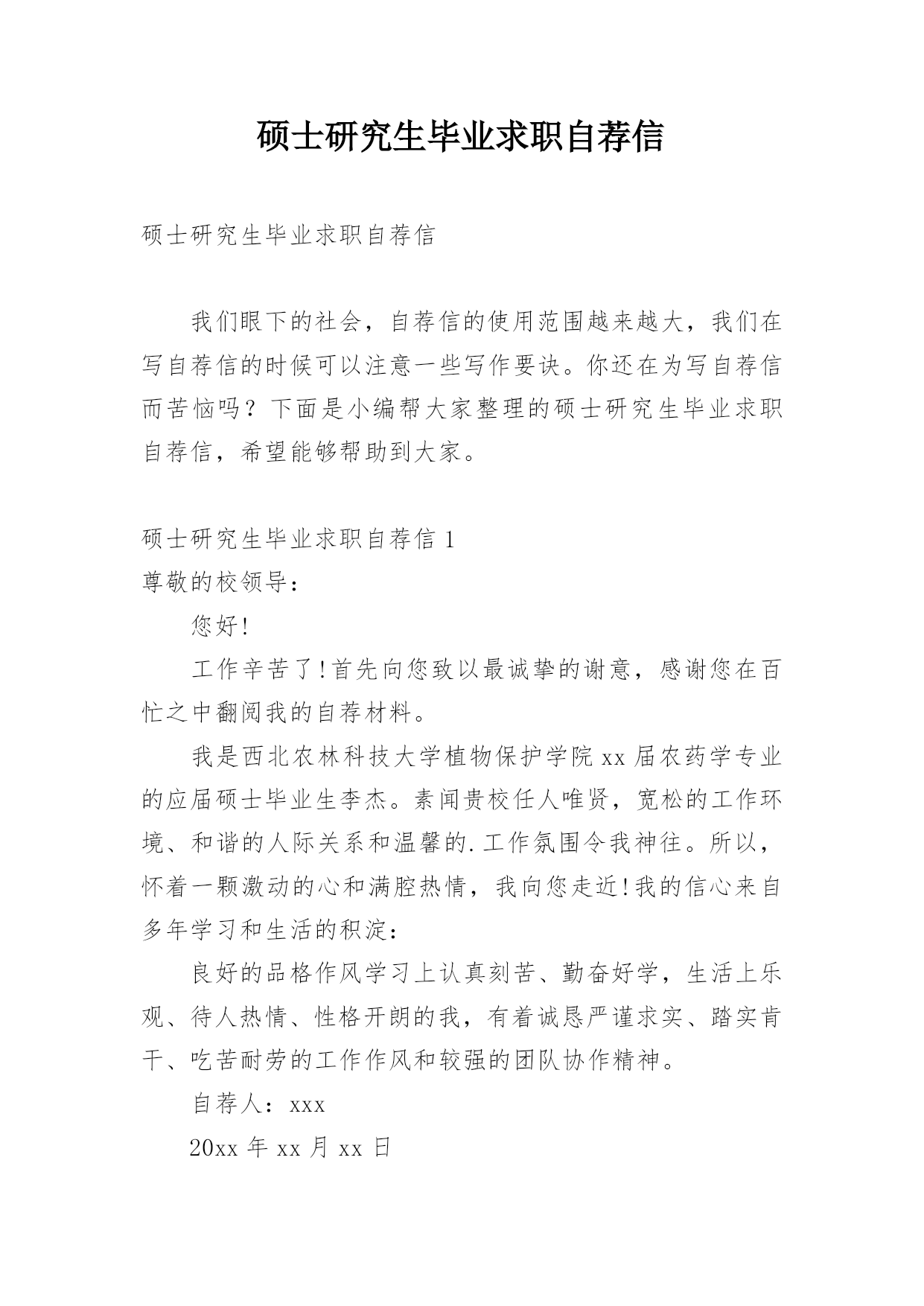 硕士研究生毕业求职自荐信硕士研究生毕业求职自荐信我们眼下的社会,自荐信的使用范围越来越大,我们在写自荐信的时候可以注意一些写作要诀。你还在为写自荐信而苦恼吗?下面是小编帮大家整理的硕士研究生毕业求职自荐信,希望能够帮助到大家。硕士研究生毕业求职自荐信1尊敬的校领导:您好!工作辛苦了!首先向您致以最诚挚的谢意,感谢您在百忙之中翻阅我的自荐材料。我是西北农林科技大学植物保护学院xx届农药学专业的应届硕士毕业生李杰。素闻贵校任人唯贤,宽松的工作环境、和谐的人际关系和温馨的.工作氛围令我神往。所以,怀着一颗激动的