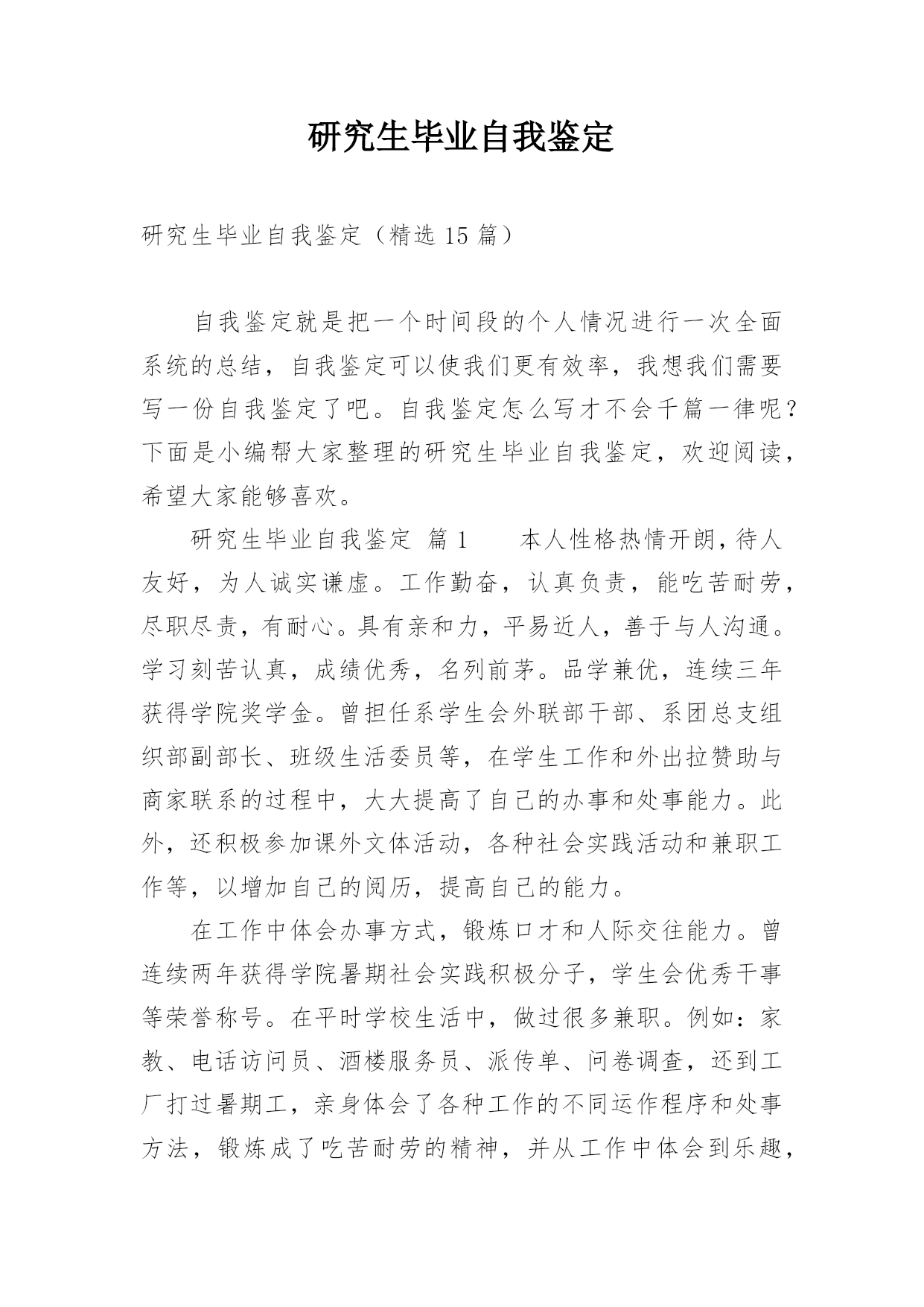 研究生毕业自我鉴定研究生毕业自我鉴定(精选15篇)自我鉴定就是把一个时间段的个人情况进行一次全面系统的总结,自我鉴定可以使我们更有效率,我想我们需要写一份自我鉴定了吧。自我鉴定怎么写才不会千篇一律呢?下面是小编帮大家整理的研究生毕业自我鉴定,欢迎阅读,希望大家能够喜欢。研究生毕业自我鉴定篇1本人性格热情开朗,待人友好,为人诚实谦虚。工作勤奋,认真负责,能吃苦耐劳,尽职尽责,有耐心。具有亲和力,平易近人,善于与人沟通。学习刻苦认真,成绩优秀,名列前茅。品学兼优,连续三年获得学院奖学金。曾担任系学生会外联部干