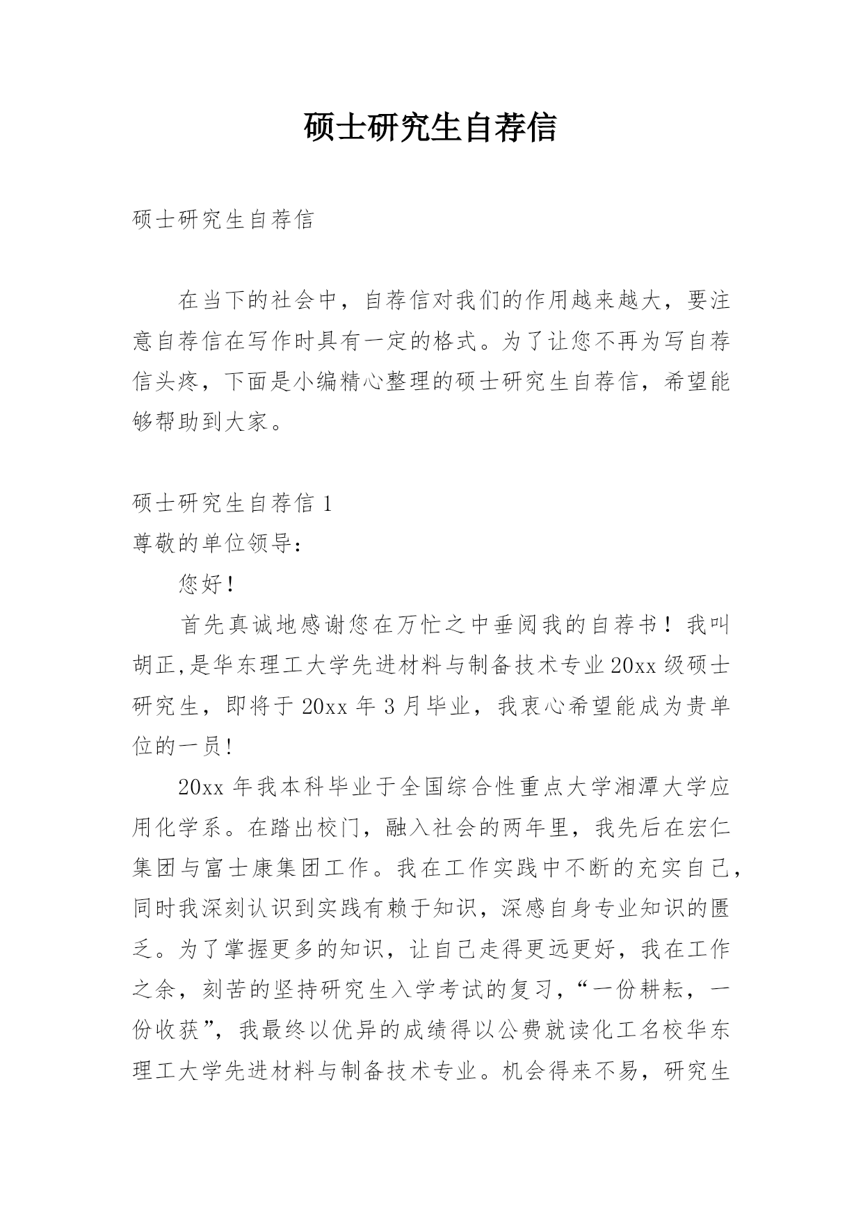 硕士研究生自荐信硕士研究生自荐信在当下的社会中,自荐信对我们的作用越来越大,要注意自荐信在写作时具有一定的格式。为了让您不再为写自荐信头疼,下面是小编精心整理的硕士研究生自荐信,希望能够帮助到大家。硕士研究生自荐信1尊敬的单位领导:您好!首先真诚地感谢您在万忙之中垂阅我的自荐书!我叫胡正,是华东理工大学先进材料与制备技术专业20xx级硕士研究生,即将于20xx年3月毕业,我衷心希望能成为贵单位的一员!20xx年我本科毕业于全国综合性重点大学湘潭大学应用化学系。在踏出校门,融入社会的两年里,我先后在宏仁集团