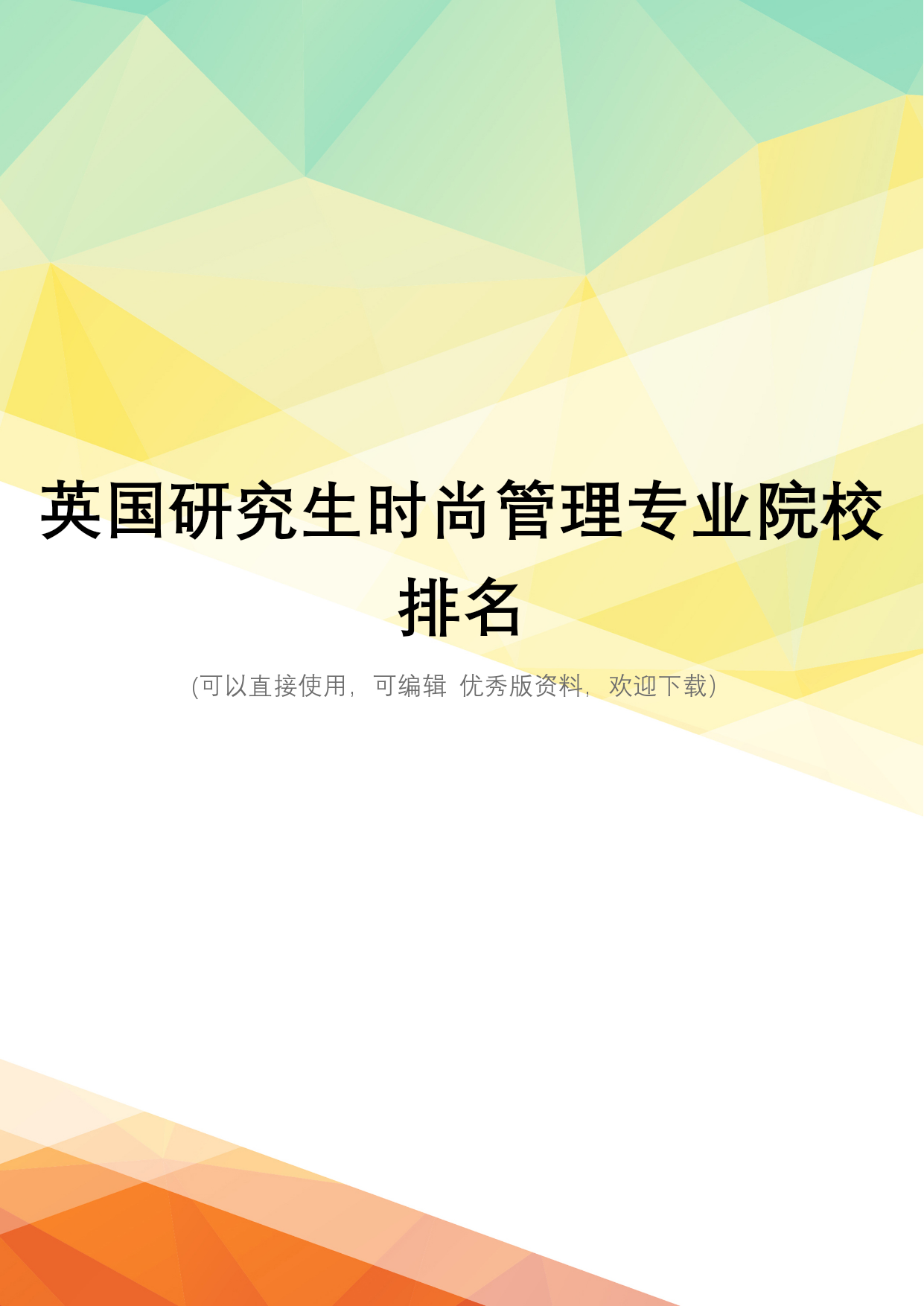 英国研究生时尚管理专业院校排名(可以直接使用,可编辑优秀版资料,欢迎下载)时尚管理专业目前在国内非常热门,这和目前国内市场需求是分不开的。目前在国内迅速发展的时尚相关的产业高端人才长期被外籍人员占据,国内缺乏相对于的人才培养经验。所以时尚管理大部分学生都是考虑到国外就读,英国是大多数人选择的国家,今天给大家介绍英国时尚管理专业院校排名,希望对你有帮助。英国研究生时尚管理专业描述时尚管理涵盖的范围非常广泛,主要是在发掘潜在客户需求和把握潮流动态基础上,通过供应链管理、生产线管理、公关活动策划、市场营销、销售