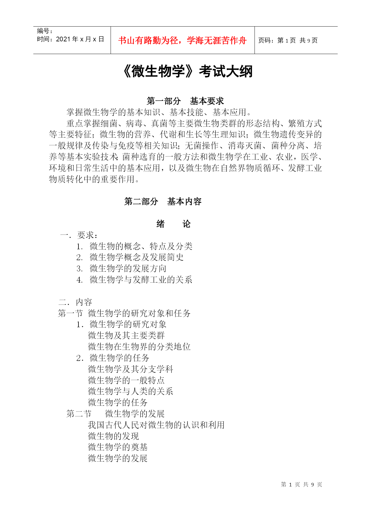 编号:时间:2021年x月x日书山有路勤为径,学海无涯苦作舟页码:第PAGE9页共NUMPAGES9页第PAGE\*MERGEFORMAT9页共NUMPAGES\*MERGEFORMAT9页《微生物学》考试大纲第一部分基本要求掌握微生物学的基本知识、基本技能、基本应用。重点掌握细菌、病毒、真菌等主要微生物类群的形态结构、繁殖方式等主要特征;微生物的营养、代谢和生长等生理知识;微生物遗传变异的一般规律及传染与免疫等相关知识;无菌操作、消毒灭菌、菌种分离、培养等基本实验技术;菌种选育的