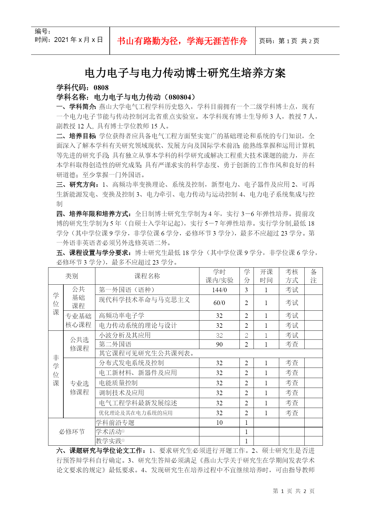 编号:时间:2021年x月x日书山有路勤为径,学海无涯苦作舟页码:第PAGE2页共NUMPAGES2页第PAGE\*MERGEFORMAT2页共NUMPAGES\*MERGEFORMAT2页电力电子与电力传动博士研究生培养方案学科代码:0808学科名称:电力电子与电力传动(080804)一、学科简介:燕山大学电气工程学科历史悠久,学科目前拥有一个二级学科博士点,现有一个电力电子节能与传动控制河北省重点实验室。本学科现有博士生导师3人,教授7人,副教授12人,具有博士学位教师15人。