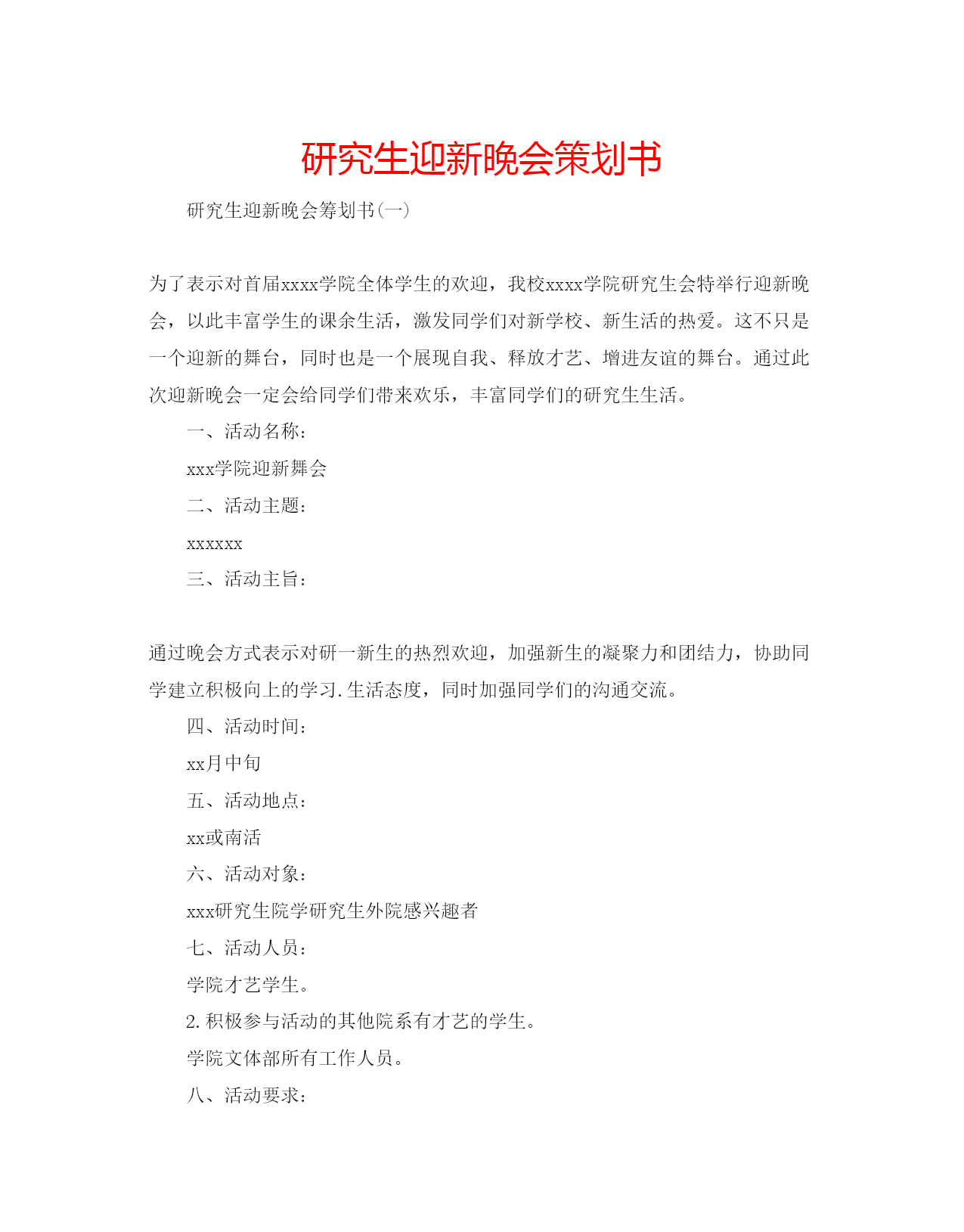 研究生迎新晚会策划书研究生迎新晚会筹划书(一)为了表示对首届xxxx学院全体学生的欢迎,我校xxxx学院研究生会特举行迎新晚会,以此丰富学生的课余生活,激发同学们对新学校、新生活的热爱。这不只是一个迎新的舞台,同时也是一个展现自我、释放才艺、增进友谊的舞台。通过此次迎新晚会一定会给同学们带来欢乐,丰富同学们的研究生生活。一、活动名称:xxx学院迎新舞会二、活动主题:xxxxxx三、活动主旨:通过晚会方式表示对研一新生的热烈欢迎,加强新生的凝聚力和团结力,协助同学建立积极向上的学习.生活态度,同时加强同学们