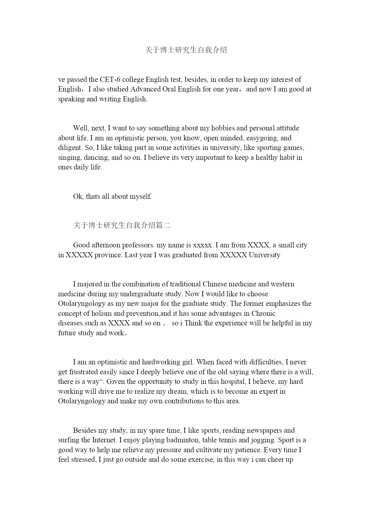 关于博士研究生自我介绍vepassedtheCET-6collegeEnglishtest,besides,inordertokeepmyinterestofEnglish,IalsostudiedAdvancedOralEnglishforoneyear,andnowIamgoodatspeakingandwritingEnglish.Well,next,Iwanttosaysomethingaboutmyhobbiesandpersonalattitudeaboutlife.Iamanoptimist