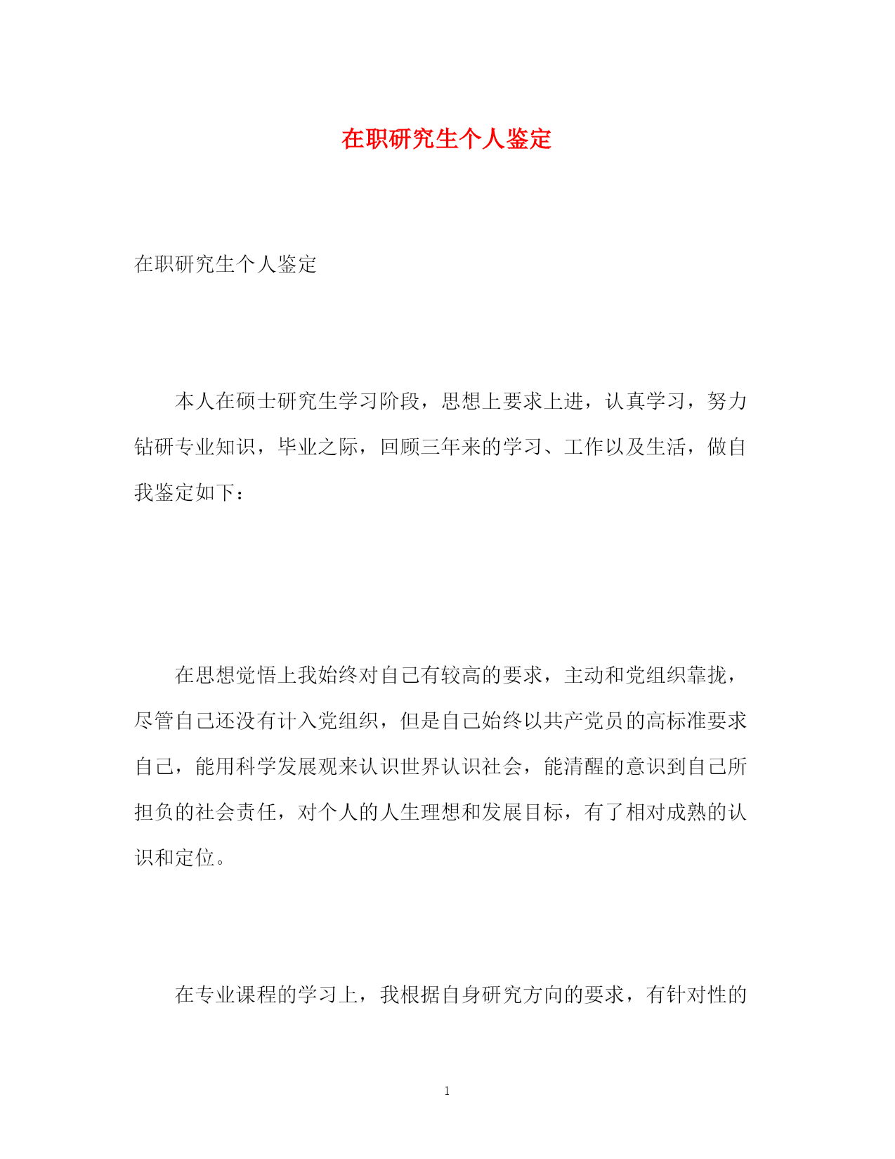 此资料由网络收集而来,如有侵权请告知上传者立即删除。资料共分享,我们负责传递知识。PAGEPAGE5在职研究生个人鉴定在职研究生个人鉴定本人在硕士研究生学习阶段,思想上要求上进,认真学习,努力钻研专业知识,毕业之际,回顾三年来的学习、工作以及生活,做自我鉴定如下:在思想觉悟上我始终对自己有较高的要求,主动和党组织靠拢,尽管自己还没有计入党组织,但是自己始终以共产党员的高标准要求自己,能用科学发展观来认识世界认识社会,能清醒的意识到自己所担负的社会责任,对个人的人生理想和发展目标,有了相对成熟的