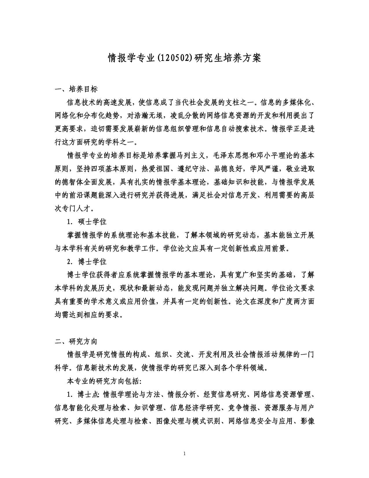 情报学专业(120502)研究生培养方案一、培养目标信息技术的高速发展,使信息成了当代社会发展的支柱之一。信息的多媒体化、网络化和分布化趋势,对浩瀚无垠,凌乱分散的网络信息资源的开发和利用提出了更高要求,迫切需要发展崭新的信息组织管理和信息自动搜索技术。情报学正是进行这方面研究的学科之一。情报学专业的培养目标是培养掌握马列主义,毛泽东思想和邓小平理论的基本原则,坚持四项基本原则,热爱祖国、遵纪守法、品德良好,学风严谨,敬业进取的德智体全面发展,具有扎实的情报学基本理论,基础知识和技能,与情报学发展中的前沿