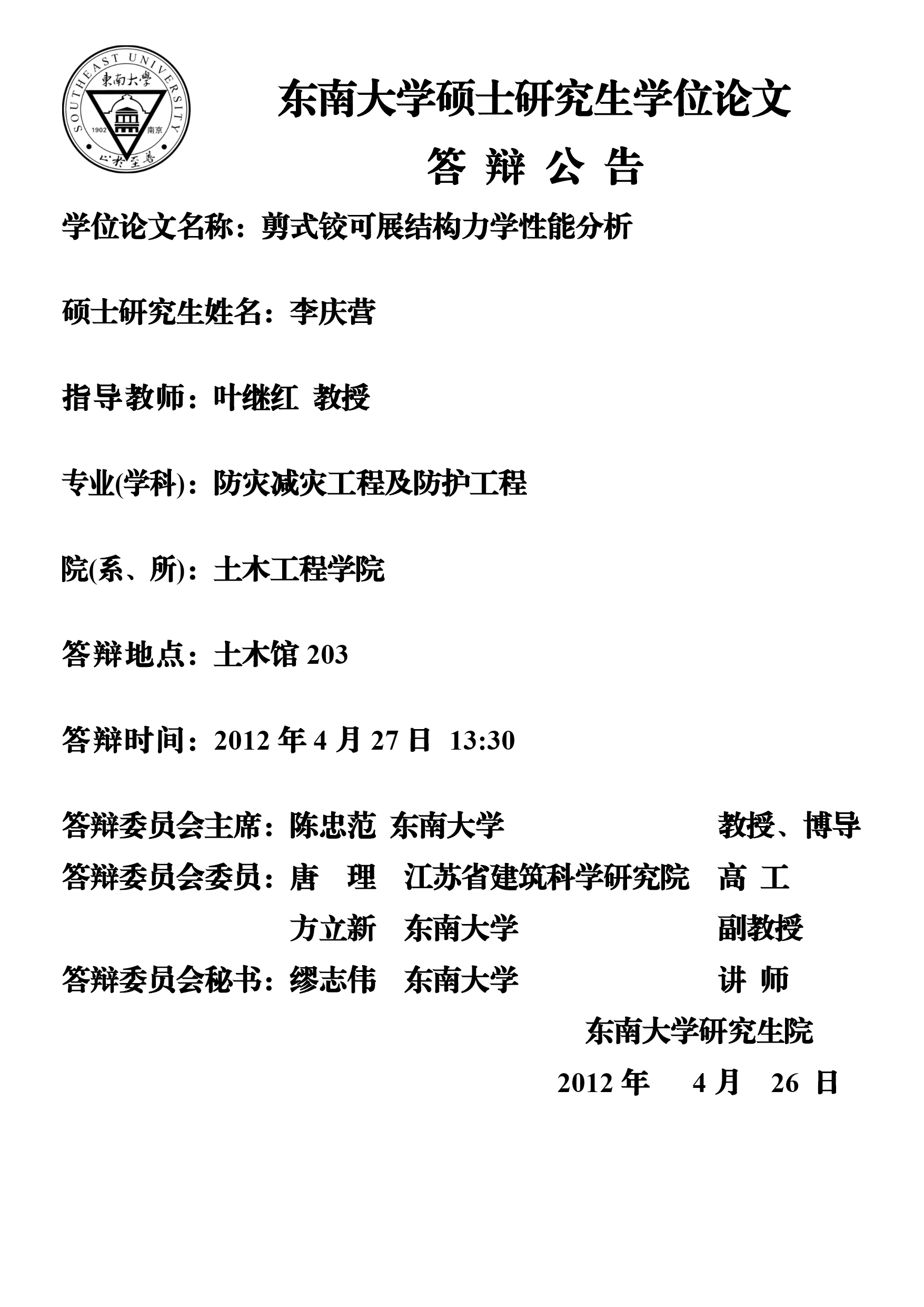 东南大学硕士研究生学位论文答辩公告学位论文名称:剪式铰可展结构力学性能分析硕士研究生姓名:李庆营指导教师:叶继红教授专业(学科):防灾减灾工程及防护工程院(系、所):土木工程学院答辩地点:土木馆203答辩时间:2012年4月27日13:30答辩委员会主席:陈忠范东南大学教授、博导答辩委员会委员:唐理江苏省建筑科学研究院高工方立新东南大学副教授答辩委员会秘书:缪志伟东南大学讲师东南大学研究生院2012年4月26日欢迎旁听!东南大学硕士研究生学位论文答辩公告学位论文名称:高性能现代混凝土本构关系的试验研究及数
