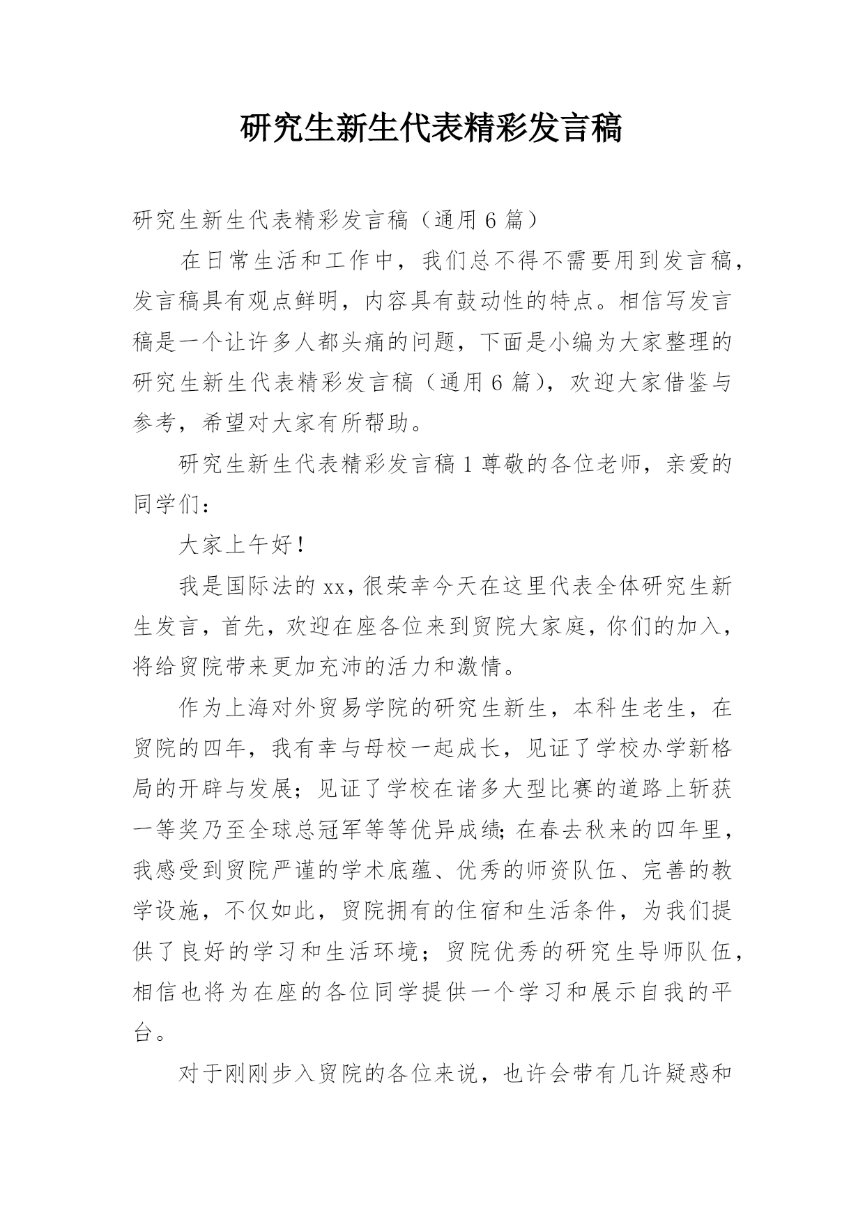 研究生新生代表精彩发言稿研究生新生代表精彩发言稿(通用6篇)在日常生活和工作中,我们总不得不需要用到发言稿,发言稿具有观点鲜明,内容具有鼓动性的特点。相信写发言稿是一个让许多人都头痛的问题,下面是小编为大家整理的研究生新生代表精彩发言稿(通用6篇),欢迎大家借鉴与参考,希望对大家有所帮助。研究生新生代表精彩发言稿1尊敬的各位老师,亲爱的同学们:大家上午好!我是国际法的xx,很荣幸今天在这里代表全体研究生新生发言,首先,欢迎在座各位来到贸院大家庭,你们的加入,将给贸院带来更加充沛的活力和激情。作为上海对外贸