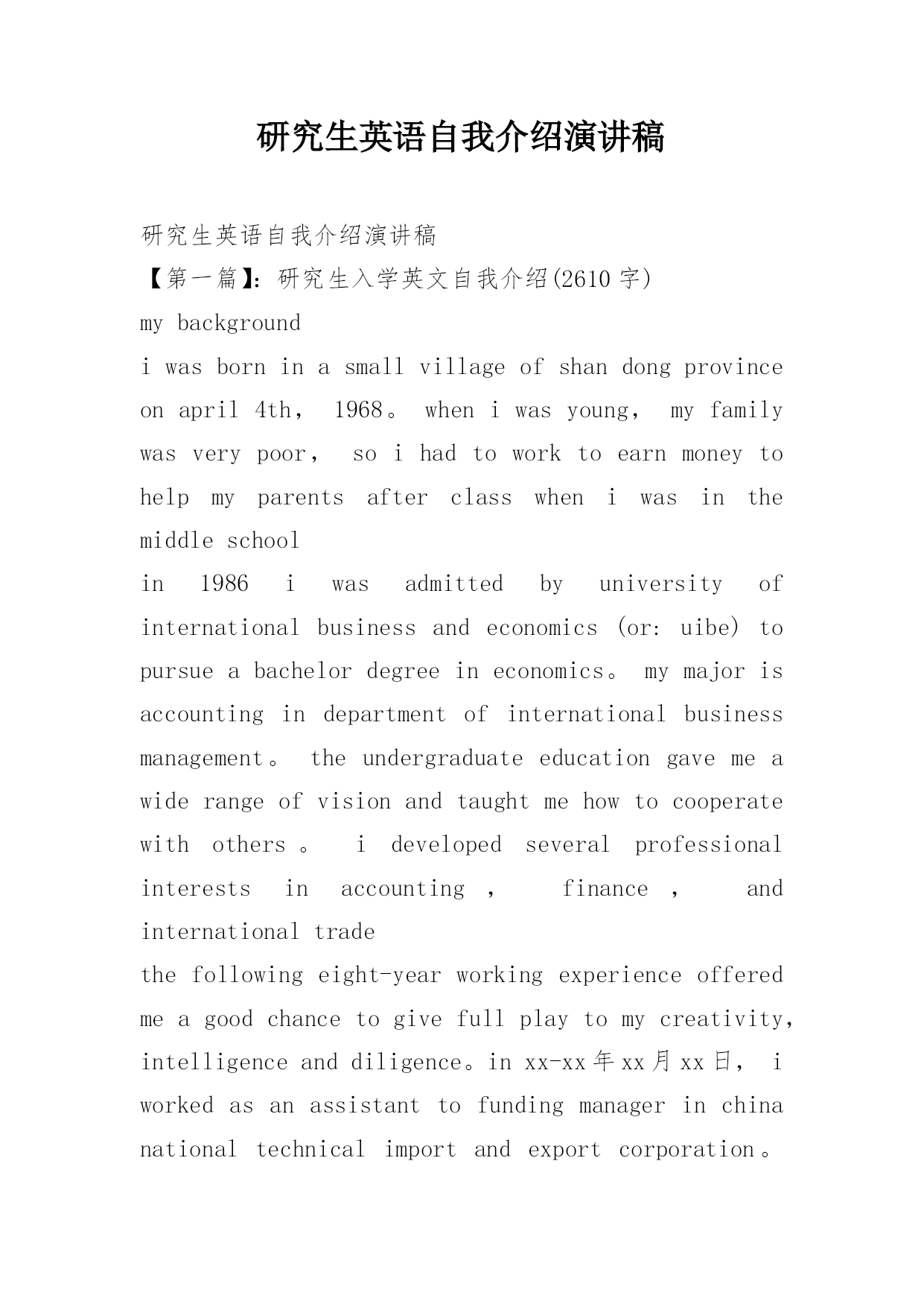研究生英语自我介绍演讲稿研究生英语自我介绍演讲稿【第一篇】:研究生入学英文自我介绍(2610字)mybackgroundiwasborninasmallvillageofshandongprovinceonapril4th,1968。wheniwasyoung,myfamilywasverypoor,soihadtoworktoearnmoneytohelpmyparentsafterclasswheniwasinthemiddleschoolin1986iwasadmittedbyuniversityo