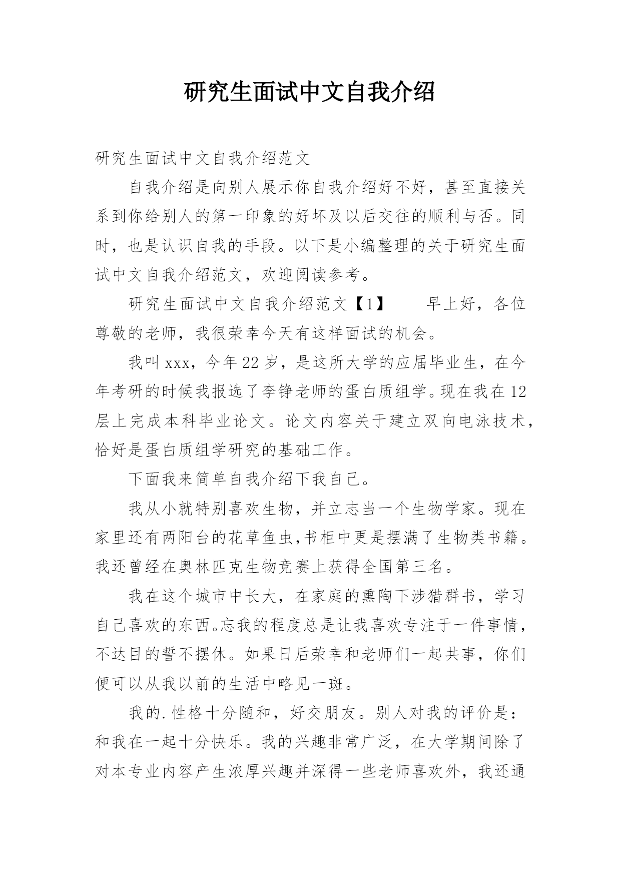 研究生面试中文自我介绍研究生面试中文自我介绍范文自我介绍是向别人展示你自我介绍好不好,甚至直接关系到你给别人的第一印象的好坏及以后交往的顺利与否。同时,也是认识自我的手段。以下是小编整理的关于研究生面试中文自我介绍范文,欢迎阅读参考。研究生面试中文自我介绍范文【1】早上好,各位尊敬的老师,我很荣幸今天有这样面试的机会。我叫xxx,今年22岁,是这所大学的应届毕业生,在今年考研的时候我报选了李铮老师的蛋白质组学。现在我在12层上完成本科毕业论文。论文内容关于建立双向电泳技术,恰好是蛋白质组学研究的基础工作。