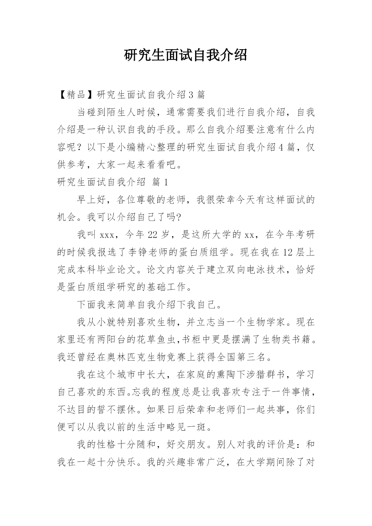 研究生面试自我介绍【精品】研究生面试自我介绍3篇当碰到陌生人时候,通常需要我们进行自我介绍,自我介绍是一种认识自我的手段。那么自我介绍要注意有什么内容呢?以下是小编精心整理的研究生面试自我介绍4篇,仅供参考,大家一起来看看吧。研究生面试自我介绍篇1早上好,各位尊敬的老师,我很荣幸今天有这样面试的机会。我可以介绍自己了吗?我叫xxx,今年22岁,是这所大学的xx,在今年考研的时候我报选了李铮老师的蛋白质组学。现在我在12层上完成本科毕业论文。论文内容关于建立双向电泳技术,恰好是蛋白质组学研究的基础工作。下面