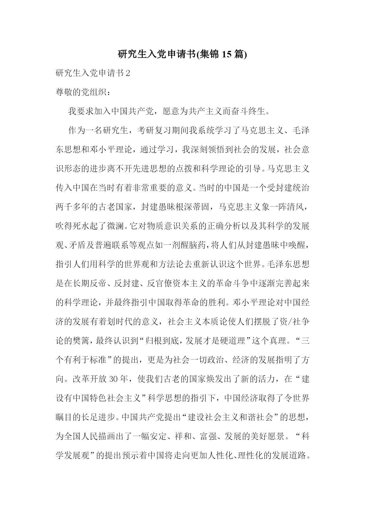 研究生入党申请书(集锦15篇)研究生入党申请书2尊敬的党组织:我要求加入中国共产党,愿意为共产主义而奋斗终生。作为一名研究生,考研复习期间我系统学习了马克思主义、毛泽东思想和邓小平理论,通过学习,我深刻领悟到社会的发展,社会意识形态的进步离不开先进思想的点拨和科学理论的引导。马克思主义传入中国在当时有着非常重要的意义。当时的中国是一个受封建统治两千多年的古老国家,封建愚昧根深蒂固,马克思主义象一阵清风,吹得死水起了微澜。它对物质意识关系的正确分析以及其科学的发展观、矛盾及普遍联系等观点如一剂醒脑药,将人们