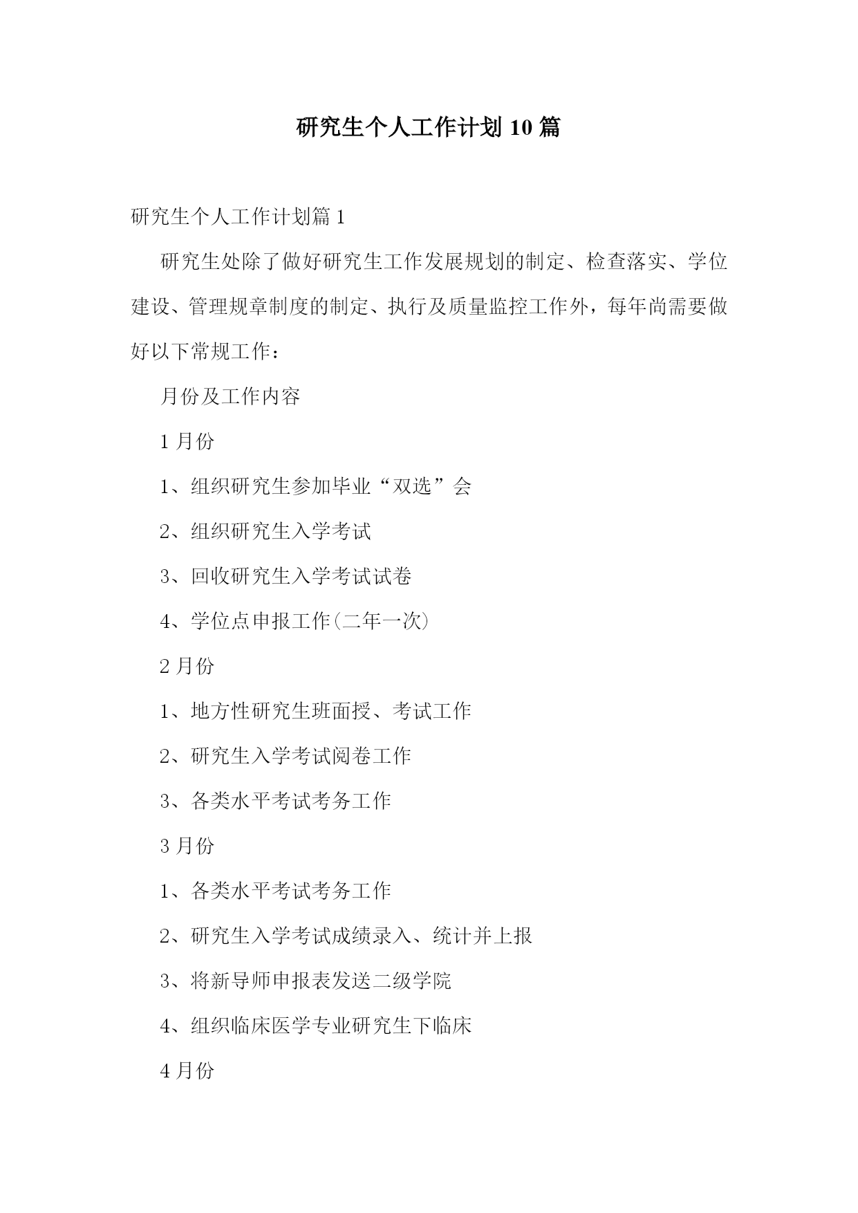 研究生个人工作计划10篇研究生个人工作计划篇1研究生处除了做好研究生工作发展规划的制定、检查落实、学位建设、管理规章制度的制定、执行及质量监控工作外,每年尚需要做好以下常规工作:月份及工作内容1月份1、组织研究生参加毕业“双选”会2、组织研究生入学考试3、回收研究生入学考试试卷4、学位点申报工作(二年一次)2月份1、地方性研究生班面授、考试工作2、研究生入学考试阅卷工作3、各类水平考试考务工作3月份1、各类水平考试考务工作2、研究生入学考试成绩录入、统计并上报3、将新导师申报表发送二级学院4、组织临床医学
