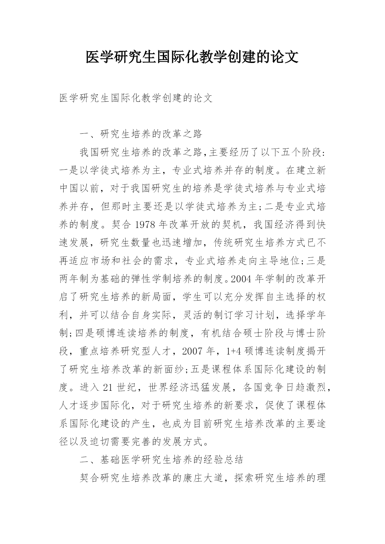 医学研究生国际化教学创建的论文医学研究生国际化教学创建的论文一、研究生培养的改革之路我国研究生培养的改革之路,主要经历了以下五个阶段:一是以学徒式培养为主,专业式培养并存的制度。在建立新中国以前,对于我国研究生的培养是学徒式培养与专业式培养并存,但那时主要还是以学徒式培养为主;二是专业式培养的制度。契合1978年改革开放的契机,我国经济得到快速发展,研究生数量也迅速增加,传统研究生培养方式已不再适应市场和社会的需求,专业式培养走向主导地位;三是两年制为基础的弹性学制培养的制度。2004年学制的改革开启了研