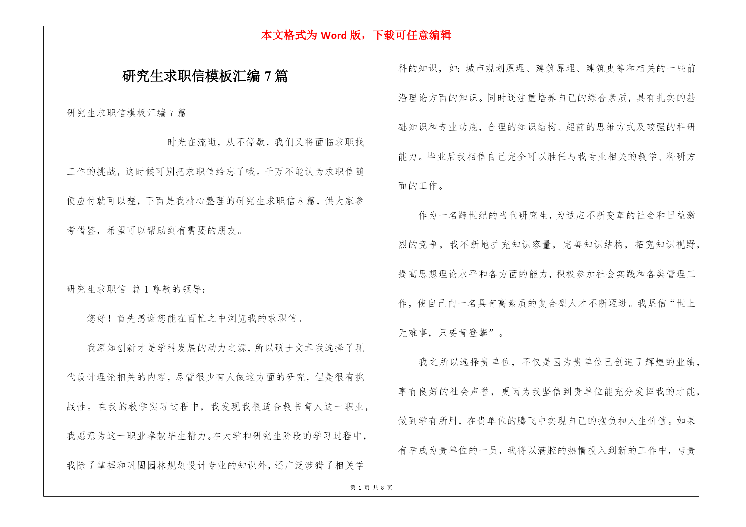 本文格式为Word版,下载可任意编辑第PAGE\*MERGEFORMAT8页共NUMPAGES\*MERGEFORMAT8页研究生求职信模板汇编7篇研究生求职信模板汇编7篇时光在流逝,从不停歇,我们又将面临求职找工作的挑战,这时候可别把求职信给忘了哦。千万不能认为求职信随便应付就可以喔,下面是我精心整理的研究生求职信8篇,供大家参考借鉴,希望可以帮助到有需要的朋友。研究生求职信篇1尊敬的领导:您好!首先感谢您能在百忙之中浏览我的求职信。我深知创新才是学科发展的动力之源,所以硕士文章我选择了现代