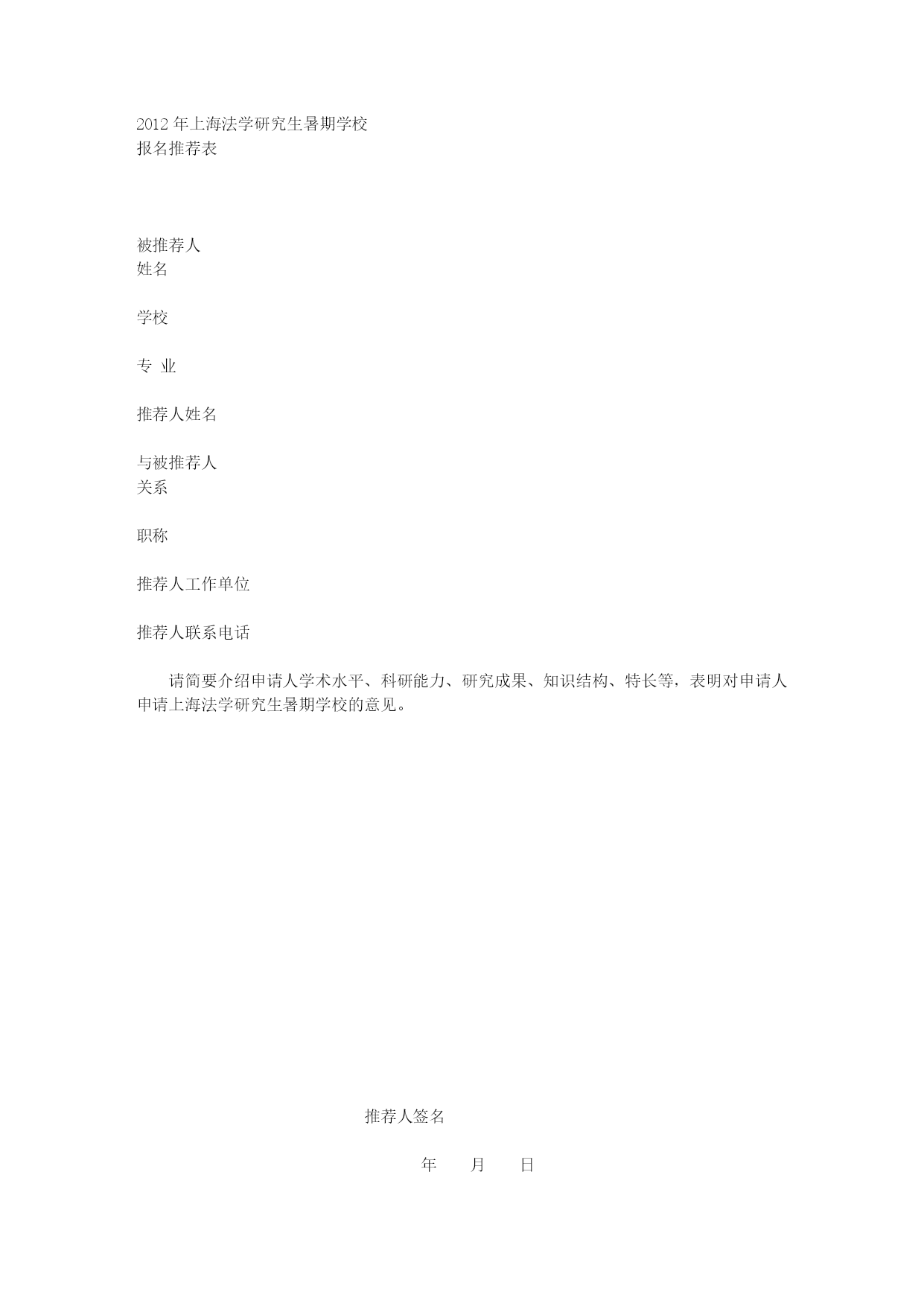 2012年上海法学研究生暑期学校报名推荐表被推荐人姓名学校专业推荐人姓名与被推荐人关系职称推荐人工作单位推荐人联系电话请简要介绍申请人学术水平、科研能力、研究成果、知识结构、特长等,表明对申请人申请上海法学研究生暑期学校的意见。推荐人签名年月日非常感谢您的推荐,由申请人将其与报名申请表一起交(寄)到上海法学研究生暑期学校组委会。