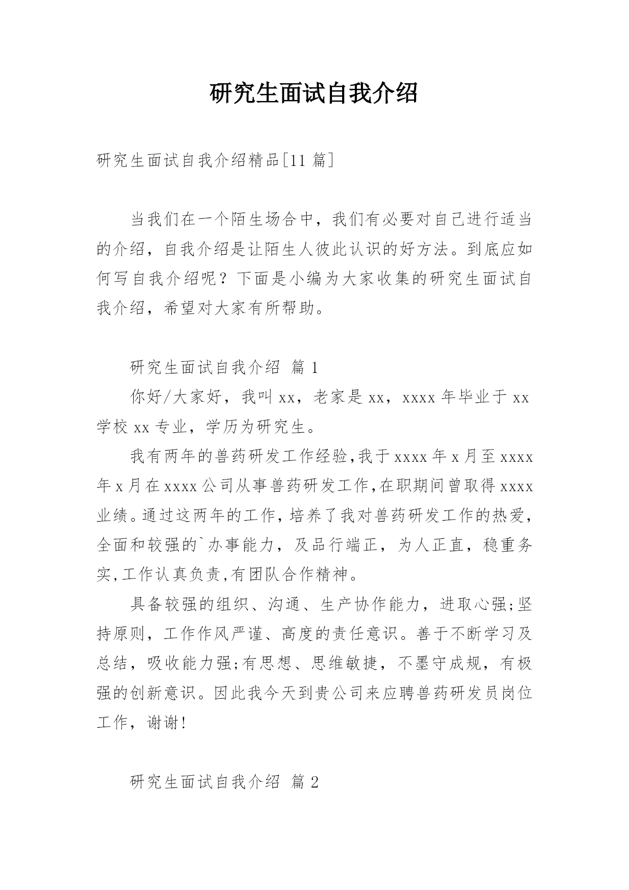 研究生面试自我介绍研究生面试自我介绍精品[11篇]当我们在一个陌生场合中,我们有必要对自己进行适当的介绍,自我介绍是让陌生人彼此认识的好方法。到底应如何写自我介绍呢?下面是小编为大家收集的研究生面试自我介绍,希望对大家有所帮助。研究生面试自我介绍篇1你好/大家好,我叫xx,老家是xx,xxxx年毕业于xx学校xx专业,学历为研究生。我有两年的兽药研发工作经验,我于xxxx年x月至xxxx年x月在xxxx公司从事兽药研发工作,在职期间曾取得xxxx业绩。通过这两年的工作,培养了我对兽药研发工作的热爱,全面和