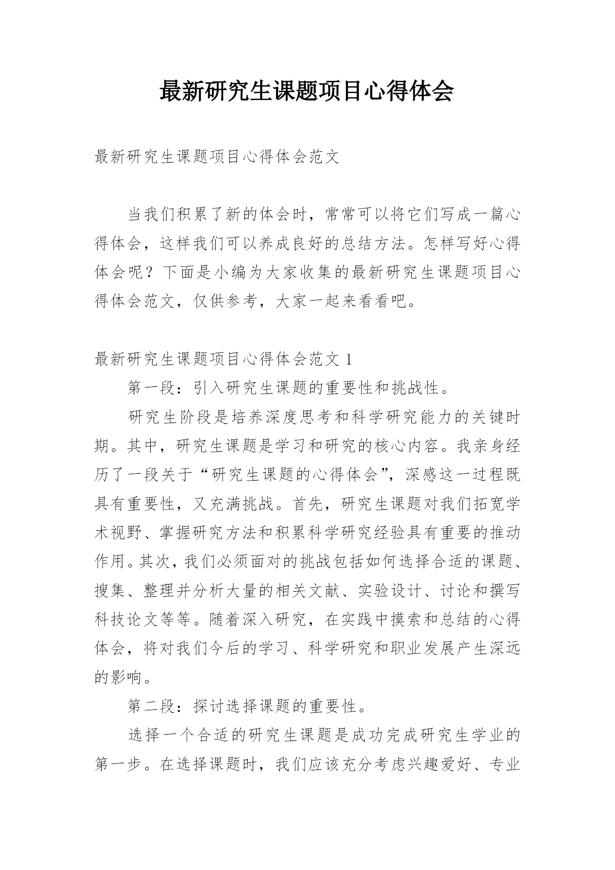 最新研究生课题项目心得体会最新研究生课题项目心得体会范文当我们积累了新的体会时,常常可以将它们写成一篇心得体会,这样我们可以养成良好的总结方法。怎样写好心得体会呢?下面是小编为大家收集的最新研究生课题项目心得体会范文,仅供参考,大家一起来看看吧。最新研究生课题项目心得体会范文1第一段:引入研究生课题的重要性和挑战性。研究生阶段是培养深度思考和科学研究能力的关键时期。其中,研究生课题是学习和研究的核心内容。我亲身经历了一段关于“研究生课题的心得体会”,深感这一过程既具有重要性,又充满挑战。首先,研究生课题对
