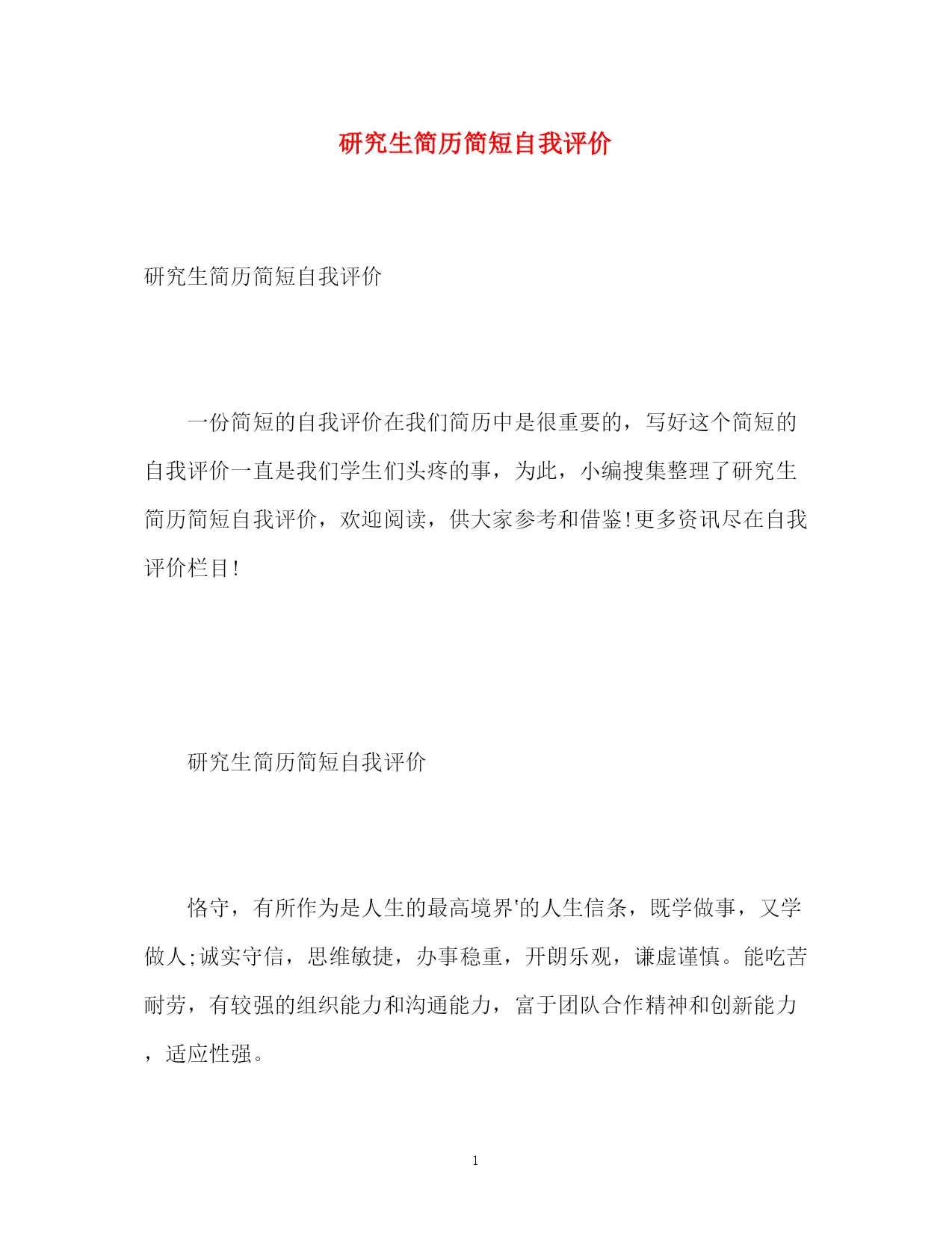 此资料由网络收集而来,如有侵权请告知上传者立即删除。资料共分享,我们负责传递知识。PAGEPAGE7研究生简历简短自我评价研究生简历简短自我评价一份简短的自我评价在我们简历中是很重要的,写好这个简短的自我评价一直是我们学生们头疼的事,为此,小编搜集整理了研究生简历简短自我评价,欢迎阅读,供大家参考和借鉴!更多资讯尽在自我评价栏目!研究生简历简短自我评价恪守,有所作为是人生的最高境界‛的人生信条,既学做事,又学做人;诚实守信,思维敏捷,办事稳重,开朗乐观,谦虚谨慎。能吃苦耐劳,有较强的组织能力和